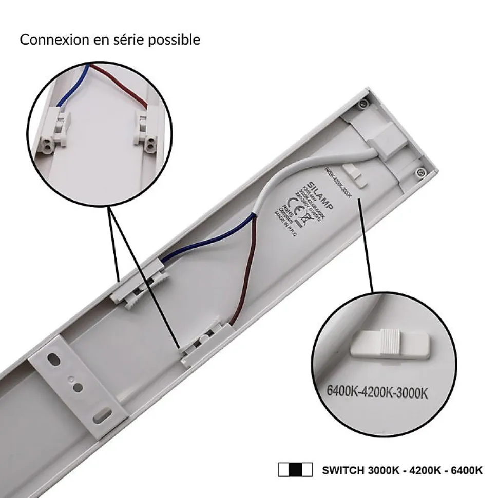 Un éclairage performant et designFaites le choix de l’excellence avec la Réglette LED 120cm Blanche 48W IP20 CCT – 3000K/4000K/6000K, un luminaire conçu pour offrir une lumière homogène et agréable.Caractéristiques essentiellesQualité d’éclairage : 4500 lm, pensée pour le confort visuel.Choix de température : CCT, pour une ambiance adaptée.Angle ajusté : 120°, garantissant une illumination complète.Pourquoi choisir ce produit ?Sa technologie avancée garantit un éclairage puissant et uniforme, idéal pour tous types d’usages.Comment l’installer ?Préparation : vérifiez votre installation et coupez l’alimentation électrique.Fixation : positionnez et fixez le luminaire selon le mode d’installation (en saillie).Connexion : raccordez les fils électriques en suivant les indications fournies.Test : remettez sous tension et assurez-vous du bon fonctionnement.Où installer ce luminaire ?Son design élégant et sa lumière homogène permettent de l’installer aussi bien dans des pièces domestiques que des locaux professionnels.Silamp France à votre serviceSilamp vous propose une large gamme de réglettes led 120cm alliant qualité et performance. Profitez d’une garantie de 2 ans et d’un service client réactif pour répondre à toutes vos questions.
