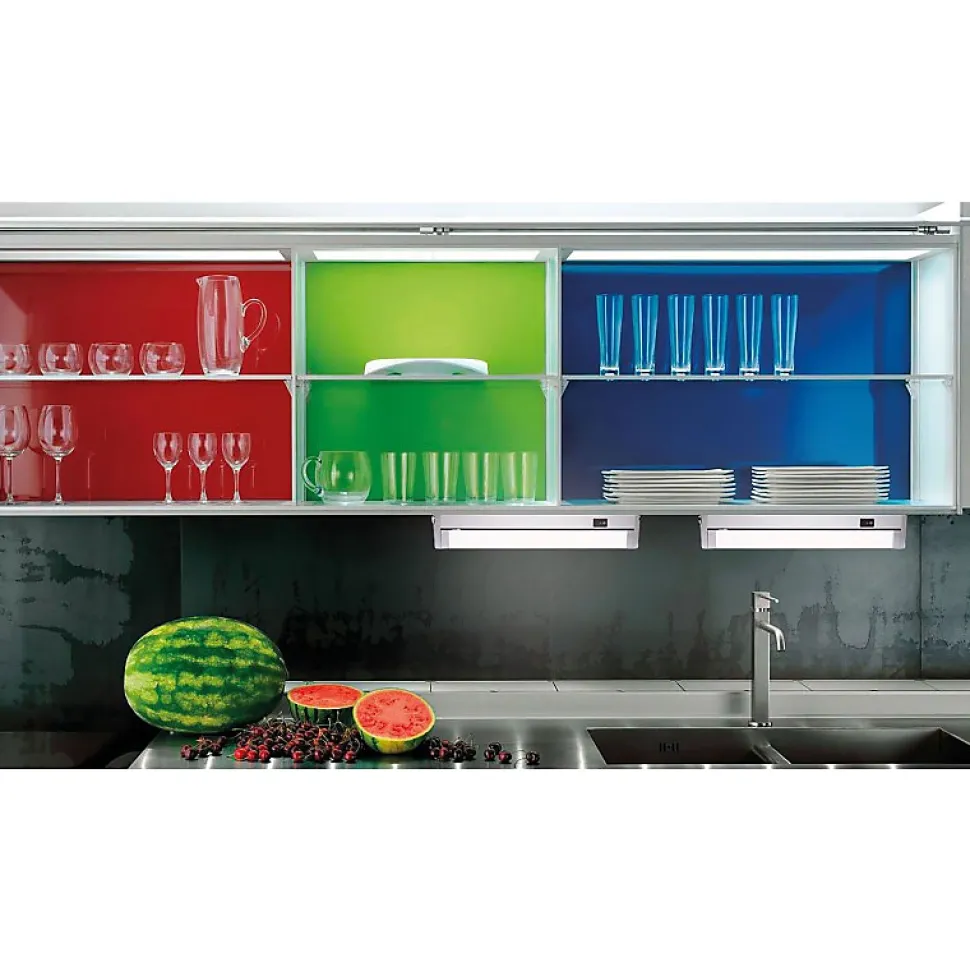 Les caractéristiques techniquesLa réglette Led Singone de Tibelec peut être installée dans une armoire,une vitrine, sous un meuble, en plafonnier ou en applique murale.Elle intègre une technologie Led basse consommation.Elle possède un interrupteur on/off infra-rouge qui fonctionne par simple passage de la main devant la cellule pour éteindre, allumer ou varier l’intensité lumineuse.Elle est également équipée d’un diffuseur orientableElle est chaînable (jusqu’à 10 éléments à partir d’une seule source d’alimentation).Les avantages esthétiquesAvec son design en aluminium mat, cette réglette Singone de Tibelec s’intrègrera dans tout les placards,armoires,vitrines et sous-meubles dans votre cuisine, votre dressing ou votre bibliothèque.Le diffuseur orientable vous permet de diriger le flux lumineux.Grâce à l’interrupteur infra-rouge, vous pourrez éteindre, allumer et varier l’intensité lumineuse simplement en passant la main devant la cellule.Elle est connectable ce qui vous permet d’installer jusqu’à 10 éléments à partir d’un seul point d’alimentation. Son éclairage blanc chaud et ses 935 lumens vous procureront une lumière efficace mais reposante.
