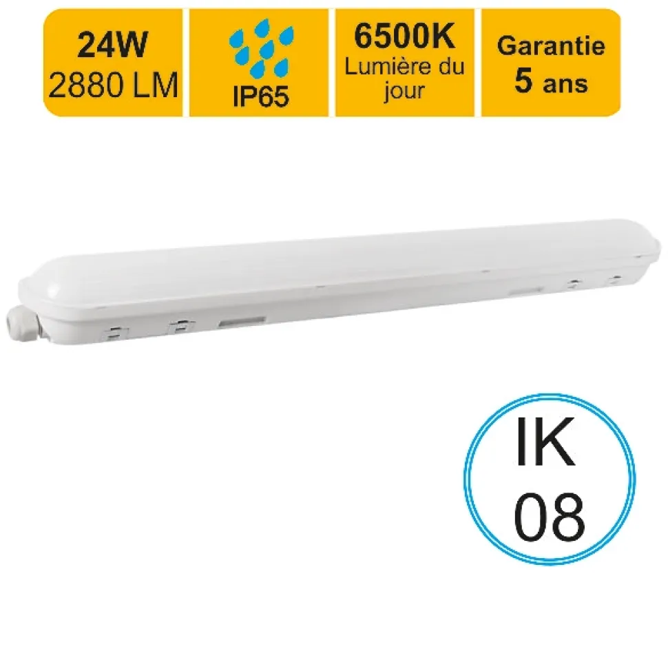 Réglette LED Étanche 1200mm – 24W (Équiv. 1x36W) – 2880 LM – lumière du jour(6500K) – IP65Un éclairage puissant et éco-énergétiqueCette réglette LED de 24W avec LED intégrée est la solution idéale pour remplacer les luminaires étanches à néon 1x36W, offrant une alternative plus performante et économique.Avec son flux lumineux élevé de 2880 lumens et une consommation réduite de 24W seulement, elle garantit des économies d’énergie considérables sans compromis sur la qualité d’éclairage. Sa température de couleur lumière du jour (6500K) assure un éclairage homogène et agréable pour tous types d’environnements professionnels ou industriels.Robuste et parfaitement étancheAvec son indice de protection IP65, cette réglette est totalement étanche à l’eau et à la poussière, idéale pour une installation en environnements exigeants : usines, parkings, garages, ateliers et entrepôts. Son indice de résistance aux chocs IK08 lui confère une excellente durabilité.Installation rapide et pratiqueSystème de câblage traversant permettant le chaînage de plusieurs réglettes sans multiplication des raccordements.Connexion simplifiée pour une installation en saillie ou suspendue en toute facilité.Caractéristiques techniques :Puissance réelle : 24WÉquivalence : 1x36WFlux lumineux : 2880 lm (120 lm/W)Ancienne norme 2012 : A+Nouvelle norme 2021 : ETempérature de couleur : 6500K (lumière du jour)Angle de diffusion : 120°Indice de protection : IP65 (étanche)Indice de résistance : IK08 (antichoc)Durée de vie : 50 000 heuresNombre de cycles ON/OFF : 30 000Facteur de puissance : > 0.9Type de LED : SMDDiffuseur : OpaqueMatériau du cadre : GrisTension : 220-240VInstallation : Saillie ou suspendueDimension : 1200 x 72 x 61 mmNormes : CE, ROHSGarantie : 5 ansApplications :Industrie & entrepôt : Usines, zones de stockageMobilité & stationnement : Parkings, garagesAteliers & locaux professionnelsUn éclairage puissant, économique et durable pour tous vos espaces !