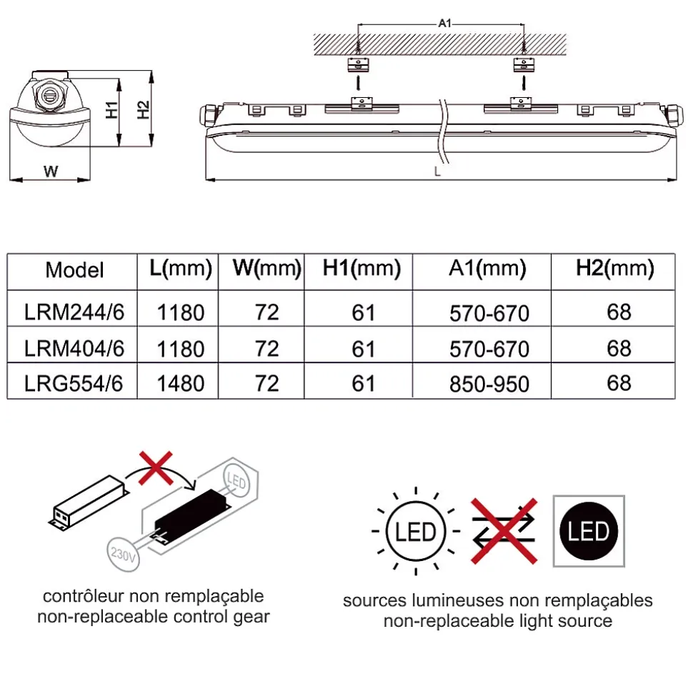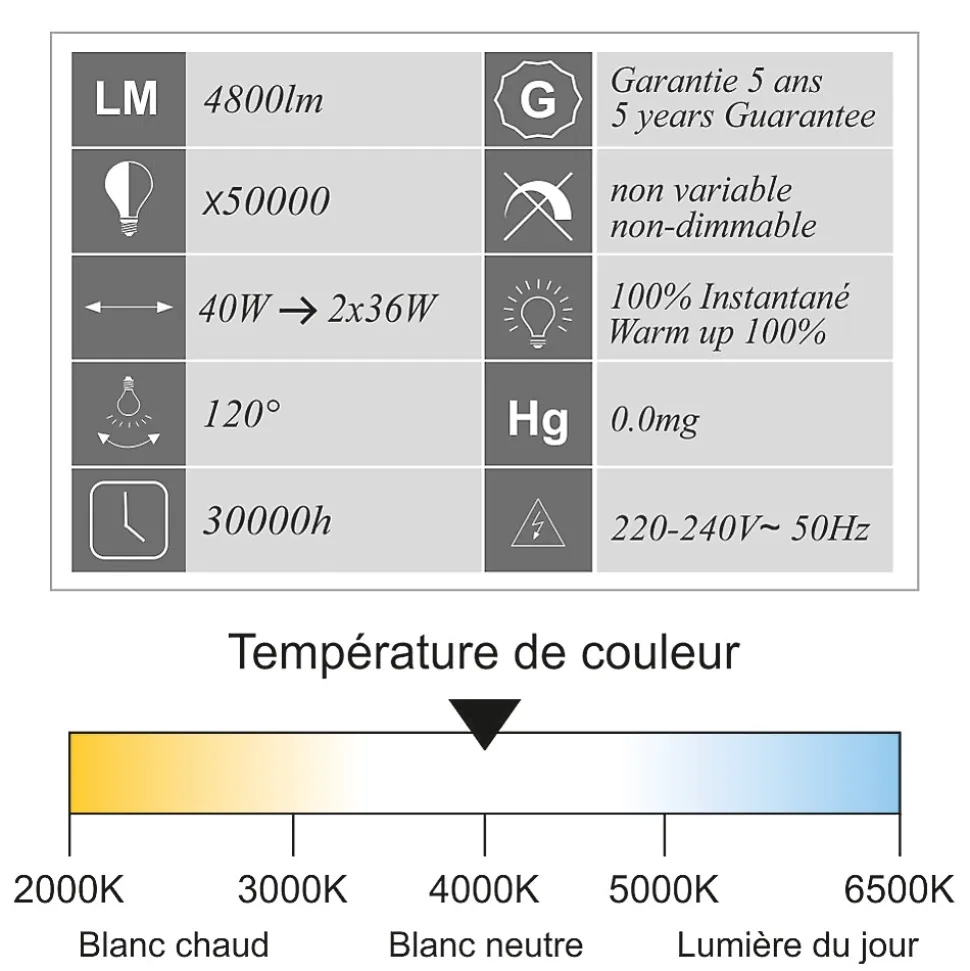 Réglette LED Étanche 1200mm – 40W (Équiv. 2x36W) – 4800 LM – blanc neutre (4000K) – IP65Un éclairage puissant et éco-énergétiqueCette réglette LED de 40W avec LED intégrée est la solution idéale pour remplacer les luminaires étanches à néon 2x36W, offrant une alternative plus performante et économique.Avec son flux lumineux élevé de 4800 lumens et une consommation réduite de 40W seulement, elle garantit des économies d’énergie considérables sans compromis sur la qualité d’éclairage. Sa température de couleur blanc neutre (4000K) assure un éclairage homogène et agréable pour tous types d’environnements professionnels ou industriels.Robuste et parfaitement étancheAvec son indice de protection IP65, cette réglette est totalement étanche à l’eau et à la poussière, idéale pour une installation en environnements exigeants : usines, parkings, garages, ateliers et entrepôts. Son indice de résistance aux chocs IK08 lui confère une excellente durabilité.Installation rapide et pratiqueSystème de câblage traversant permettant le chaînage de plusieurs réglettes sans multiplication des raccordements.Connexion simplifiée pour une installation en saillie ou suspendue en toute facilité.Caractéristiques techniques :Puissance réelle : 40WÉquivalence : 2x36WFlux lumineux : 4800 lm (120 lm/W)Ancienne norme 2012 : A+Nouvelle norme 2021 : ETempérature de couleur : 4000K (blanc neutre)Angle de diffusion : 120°Indice de protection : IP65 (étanche)Indice de résistance : IK08 (antichoc)Durée de vie : 50 000 heuresNombre de cycles ON/OFF : 30 000Facteur de puissance : > 0.9Type de LED : SMDDiffuseur : OpaqueMatériau du cadre : GrisTension : 220-240VInstallation : Saillie ou suspendueDimension : 1200 x 72 x 61 mmNormes : CE, ROHSGarantie : 5 ansApplications :Industrie & entrepôt : Usines, zones de stockageMobilité & stationnement : Parkings, garagesAteliers & locaux professionnelsUn éclairage puissant, économique et durable pour tous vos espaces !