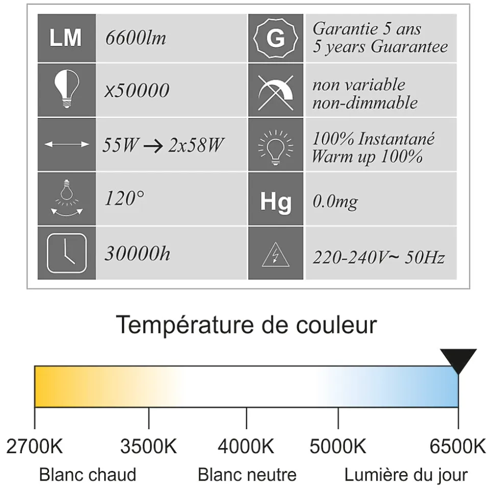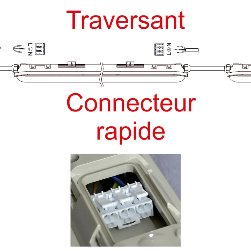 Réglette LED Étanche 1500mm – 55W (Équiv. 2x58W) – 6600 LM – lumière du jour(6500K) – IP65Un éclairage puissant et éco-énergétiqueCette réglette LED de 55W avec LED intégrée est la solution idéale pour remplacer les luminaires étanches à néon 2x58W, offrant une alternative plus performante et économique.Avec son flux lumineux élevé de 6600 lumens et une consommation réduite de 55W seulement, elle garantit des économies d’énergie considérables sans compromis sur la qualité d’éclairage. Sa température de couleur lumière du jour (6500K) assure un éclairage homogène et agréable pour tous types d’environnements professionnels ou industriels.Robuste et parfaitement étancheAvec son indice de protection IP65, cette réglette est totalement étanche à l’eau et à la poussière, idéale pour une installation en environnements exigeants : usines, parkings, garages, ateliers et entrepôts. Son indice de résistance aux chocs IK08 lui confère une excellente durabilité.Installation rapide et pratiqueSystème de câblage traversant permettant le chaînage de plusieurs réglettes sans multiplication des raccordements.Connexion simplifiée pour une installation en saillie ou suspendue en toute facilité.Caractéristiques techniques :Puissance réelle : 55WÉquivalence : 2x58WFlux lumineux : 6600 lm (120 lm/W)Ancienne norme 2012 : A+Nouvelle norme 2021 : ETempérature de couleur : 6500K (lumière du jour)Angle de diffusion : 120°Indice de protection : IP65 (étanche)Indice de résistance : IK08 (antichoc)Durée de vie : 50 000 heuresNombre de cycles ON/OFF : 30 000Facteur de puissance : > 0.9Type de LED : SMDDiffuseur : OpaqueMatériau du cadre : GrisTension : 220-240VInstallation : Saillie ou suspendueDimension : 1500 x 72 x 61 mmNormes : CE, ROHSGarantie : 5 ansApplications :Industrie & entrepôt : Usines, zones de stockageMobilité & stationnement : Parkings, garagesAteliers & locaux professionnelsUn éclairage puissant, économique et durable pour tous vos espaces !