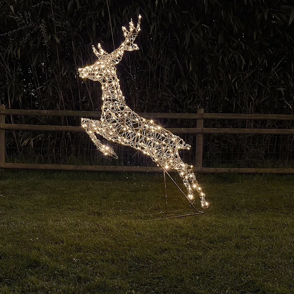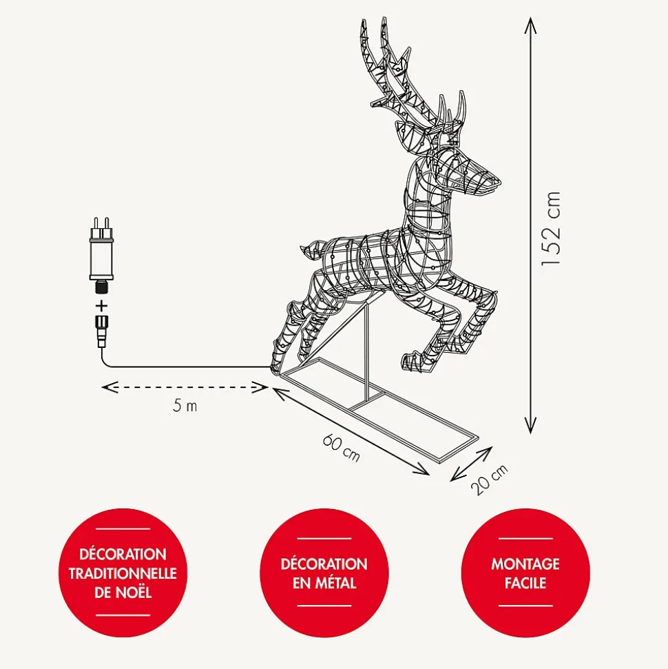 Sublimez votre décoration avec ce magnifique renne lumineux féérique. En intérieur ou en extérieur, il illumine vos fêtes.• Nb de LED : 240 LED• Couleur de LED : Blanc chaud• Animation : Fixe• Dimensions : H1.52m x L0.6m• Luminosité : 500 lumens• Puissance : 7W• Tension : 230V• Alimentation : sur secteur• Couleur du câble : Marron• Matière : Structure en acier et câble en PVC souple• Prolongeable : non• Usage : Intérieur/Extérieur• Indice de protection : IP44• Garantie : 2 ansUsage & installation :Ce magnifique renne lumineux féerique est simple d’installation. Doté de l’indice de protection IP44, Il résistera à toutes les météos. Simple d’utilisation, il vous suffit de le brancher à une prise secteur grâce au câble de 5m inclus.Données techniques & dimensions :Ce renne lumineux féérique est livré avec des accessoires de fixation au sol (6 sardines à planter au sol). Il fonctionne sur secteur, vous avez juste à le brancher à une prise électrique. Le câble entre la prise et le renne mesure 5m. Le renne est livré en 4 parties à monter. Il mesure 1.52m de hauteur et 60cm de largeur. Source lumineuse :Ce renne lumineux féerique est composé de 240 LED blanc chaud fixe. Sa luminosité est de 500 lumens.