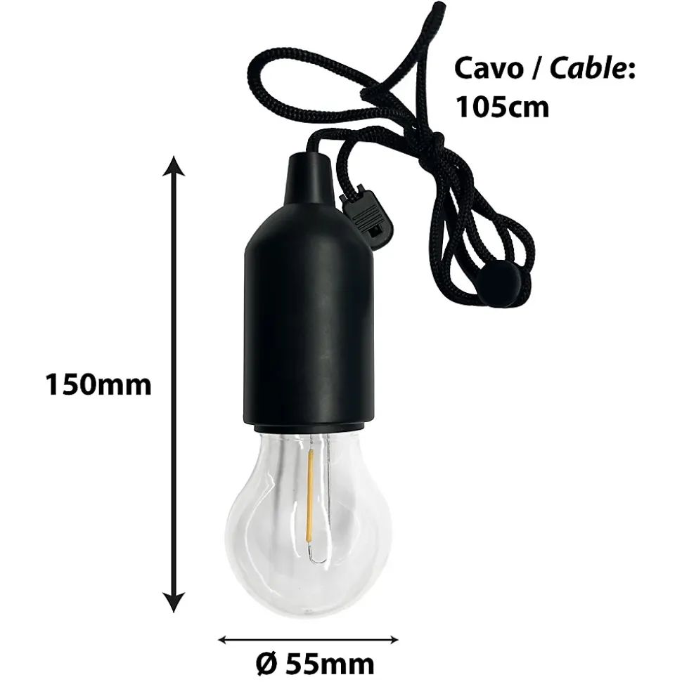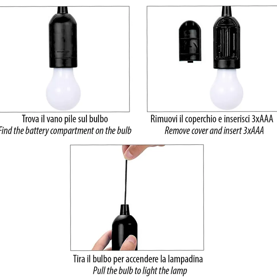 Simple : accrochez-la où vous voulez grâce au cordon. Tirez une fois : la lumière bien diffusée s’allume ; tirez une deuxième fois : elle s’éteint.Extrêmement pratique : c’est une ampoule à piles pratique et fonctionnelle ; elle fonctionne avec 3 piles AAA (non fournies) ; vous pouvez donc apporter de la lumière là où vous n’avez pas de prises de courant et de points lumineux. 24 heures d’autonomie (utilisation continue).Sûre : l’ampoule ne chauffe pas, elle reste froide et la lumière LED fournit immédiatement un éclairage agréable, uniforme, diffus et pourtant puissant (75 lumens).Robuste : Fabriquée dans un matériau très robuste, ce qui rend l’ampoule résistante aux chocs ; Cordon : 100 cm visible.Lumière chaude 2700K : idéale pour créer une ambiance chaleureuse dans votre intérieur. Parfait pour les armoires, placards, chambres, camping…