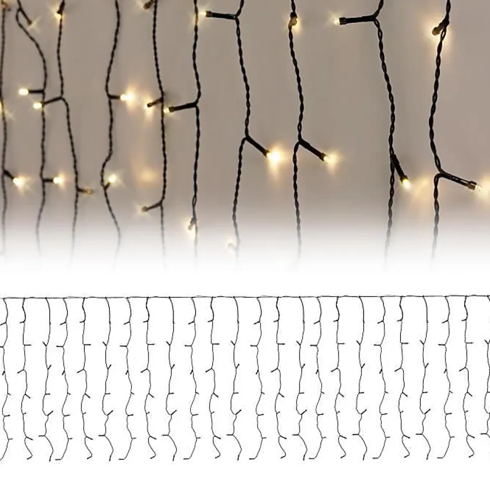 Ce magnifique rideau lumineux de 2m de longueur est idéal pour être suspendu à l’extérieur ou à l’intérieur. Il est doté de 200 LED blanc chaud avec un effet flashing et une distance de 10 cm entre chaque LED. Le rideau est en PVC noir avec une classe de protection IP44. Il est facile à installer et très durable grâce aux matériaux de haute qualité utilisés.