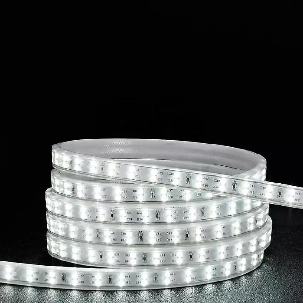 Ruban LED 220V fin recoupable 50m double rangée (SMD 2835 – 180 LED/m) IP65, la solution linéaire « grande longueur » pour balisage et éclairage périphérique sans transfo, avec un ROI immédiat vs 1350W d’ancienne techno.Confort visuel & homogénéité de ce ruban LED 220V (SMD 2835 double rangée)Grâce aux LED SMD 2835 en double rangée et une densité de 180 LED/m, le ruban LED 50m offre une ligne lumineuse plus continue et régulière sur corniches, bandeaux, façades et gorges. Son faisceau 120° limite les zones d’ombre et améliore la lecture des volumes (circulations, vitrines, signalétique). Avec un IRC Ra80, vous gardez un rendu couleur fiable en retail/tertiaire. Disponible en blanc chaud (2300-3500K), blanc neutre (4000-5500K) ou blanc froid (6000-8000K) selon l’ambiance recherchée.Pose rapide & relamping « grande longueur » (50m, direct secteur 220-240V)Le ruban LED 220-240V AC est pensé pour les chantiers où l’on veut réduire les accessoires : pas de transformateur 12/24V à dimensionner, moins de points d’alimentation à gérer. Le format 50 mètres permet de traiter des linéaires étendus (périmètres, auvents, couloirs, locaux techniques) avec une mise en œuvre plus rapide. La coupe est maîtrisée grâce à une distance de découpe de 50 cm, pratique pour ajuster au plus juste sur site.Performance & ROI (9W/m, 42 500 lm par bobine, équivalent 1350W)Avec 9W/m (soit 450W la bobine) pour 42 500 lm au total (≈ 850 lm/m) et une efficacité d’environ 94 lm/W, ce ruban LED 220V sécurise un niveau d’éclairement élevé tout en réduisant drastiquement la consommation. L’équivalence 1350W facilite la justification économique en remplacement d’anciennes solutions énergivores sur linéaires longs : même usage, puissance nettement abaissée → ROI accéléré.Durabilité & normes (IP65, ~25 000h, CE/RoHS) pour maintenance réduiteSa protect