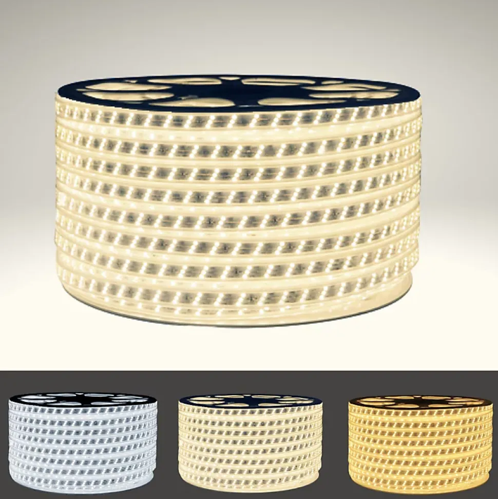 Ce ruban LED 220V de 50 mètres est la solution idéale pour vos besoins d’éclairage en grande longueur. Grâce à sa triple rangée de LED SMD 2835, il offre une intensité lumineuse exceptionnelle, une excellente couverture et une protection IP65 contre les projections d’eau.Détails techniques du ruban LED IP65 50m triple lignePensé pour les professionnels comme pour les particuliers, ce ruban est performant, résistant et ultra lumineux :Puissance : 550W, puissance élevée pour un éclairage très intense.Flux lumineux : 45 000 lumens, éclaire de grandes surfaces sans effort.Rendement lumineux : 82 lm/W, bon rapport lumière/consommation.Technologie LED : SMD 2835, haute efficacité, longue durée de vie.Nombre de LED : 180 LED/m, triple rangée pour une densité maximale.Tension : 220-240V AC, branchement direct sur secteur.Angle de diffusion : 180°, éclairage très large et uniforme.Indice de protection : IP65, étanche aux projections d’eau et à la poussière.IRC : ≥ 80, rendu fidèle des couleurs.Dimensions : 50 000 cm x 1,6 cm x 0,6 cm, pour une grande couverture lumineuse.Recoupable : tous les 50 cm, ajustable à vos besoins.Dimmable : oui, compatible avec variateur pour LED 220V.Durée de vie : environ 25 000 heures, fiabilité à long terme.Température de fonctionnement : de -20°C à +45°C.Certifications : CE & RoHS, conforme aux normes de sécurité.Garantie : 2 ans.* Pou