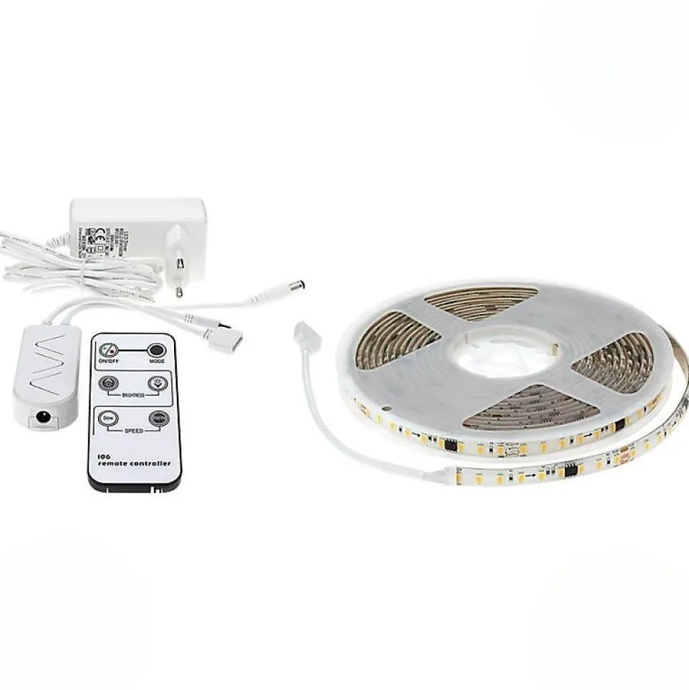 Compact, étanche et facile à installer, ce ruban LED 5M effet dynamique 12V vous permet de créer une ambiance lumineuse animée, à l’intérieur comme en extérieur abrité. Livré avec télécommande et transformateur, il est prêt à l’emploi.Spécifications du ruban LED dynamique 12V IP65 5 mètresTechnologie LED : SMD 2835, avec 126 LED/m pour une bonne densité lumineuse.Puissance : 24W (soit 4,8W/m), idéal pour un éclairage d’ambiance économe.Flux lumineux : 2 160 lumens, soit 90 lm/W.Tension d’alimentation : 12V DC, basse tension, sûre et stable.Effets dynamiques intégrés : clignotement, défilement, fondu, réglables via télécommande.Dimmable : compatible avec variateur et télécommande pour ajuster l’intensité.Indice de protection : IP65, protégé contre les projections d’eau.Angle de diffusion : 120° pour un éclairage étendu et homogène.Dimensions : 5 m de long, 8 mm de large, 2 mm d’épaisseur.Recoupable tous les 7 cm : pour s’adapter à toutes les longueurs.Température de fonctionnement : -20°C à +40°C.Durée de vie : ~25 000 heures.Certifications : CE & RoHS.Garantie : 2 ans.Kit complet :Ruban LED 5M IP65Télécommande multifonctionsTransformateur 12VPourquoi choisir ce ruban LED 12V avec animation lumineuse ?Le ruban LED dynamique 12V IP65 est idéal pour créer une ambiance vivante et per