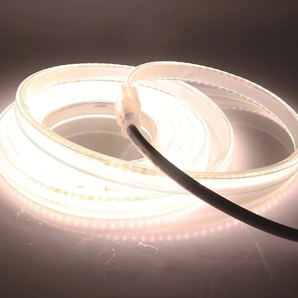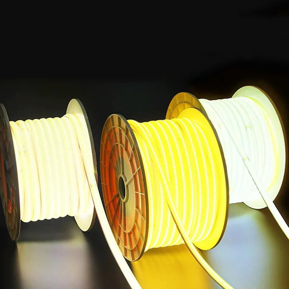 Ruban LED COB 220V recoupable 50m IP65 (432 LED/m) : la solution d’éclairage linéaire longue distance pour corniches, façades et balisage extérieur, sans transformateur, qui accélère la pose et sécurise vos chantiers (CE/RoHS) tout en délivrant 60 000 lm.Confort visuel & rendu continu du ruban LED COB 220V (432 LED/m)Grâce à la technologie COB (ligne lumineuse continue) et une densité de 432 LED/m, ce ruban LED COB 220V supprime l’effet « pointillé » des rubans SMD classiques : idéal en éclairage indirect, main courante, corniche, enseigne ou mise en valeur architecturale. Son angle 120° offre une diffusion homogène et son IRC Ra80 assure un rendu propre en tertiaire/retail. Disponible en blanc chaud (2300-3500K), blanc neutre (4000-5500K) et blanc froid (6000-8000K) pour adapter la prescription à l’usage.Installation express sur grandes longueurs : ruban LED COB 220-240V direct secteurLe ruban LED COB 220V 50m se raccorde en 220-240V AC / 50-60Hz, ce qui élimine la gestion des alimentations 12/24V sur les longues lignes (moins de drivers = moins de pannes). La bobine 50 m permet de traiter rapidement des linéaires continus (périmètres, bandeaux, façades) avec un câblage simplifié. Le ruban est recoupable tous les 15 cm, pratique pour ajuster au plus juste sur chantier et limiter les chutes.Performance & ROI : 1200 lm/m pour 13 W/m (équivalence 1950W sur 50 m)Avec 1200 lm/m pour 13 W/m, vous obtenez un rendement d’environ 92 lm/W : un bon levier pour réduire la puissance installée sur relamping linéaire. Sur une bobine complète, cela représente 60 000 lm pour 650W, avec une équivalence incandescence 1950W : l’écart de puissance se traduit directement en économies d’énergie, surtout sur des temps de fonctionnement élevés (bâtiments tertiaires, enseignes, balisage nocturne).Durabilité & normes IP65 : maintenance réduite + sécurité 220V obligatoireClassé