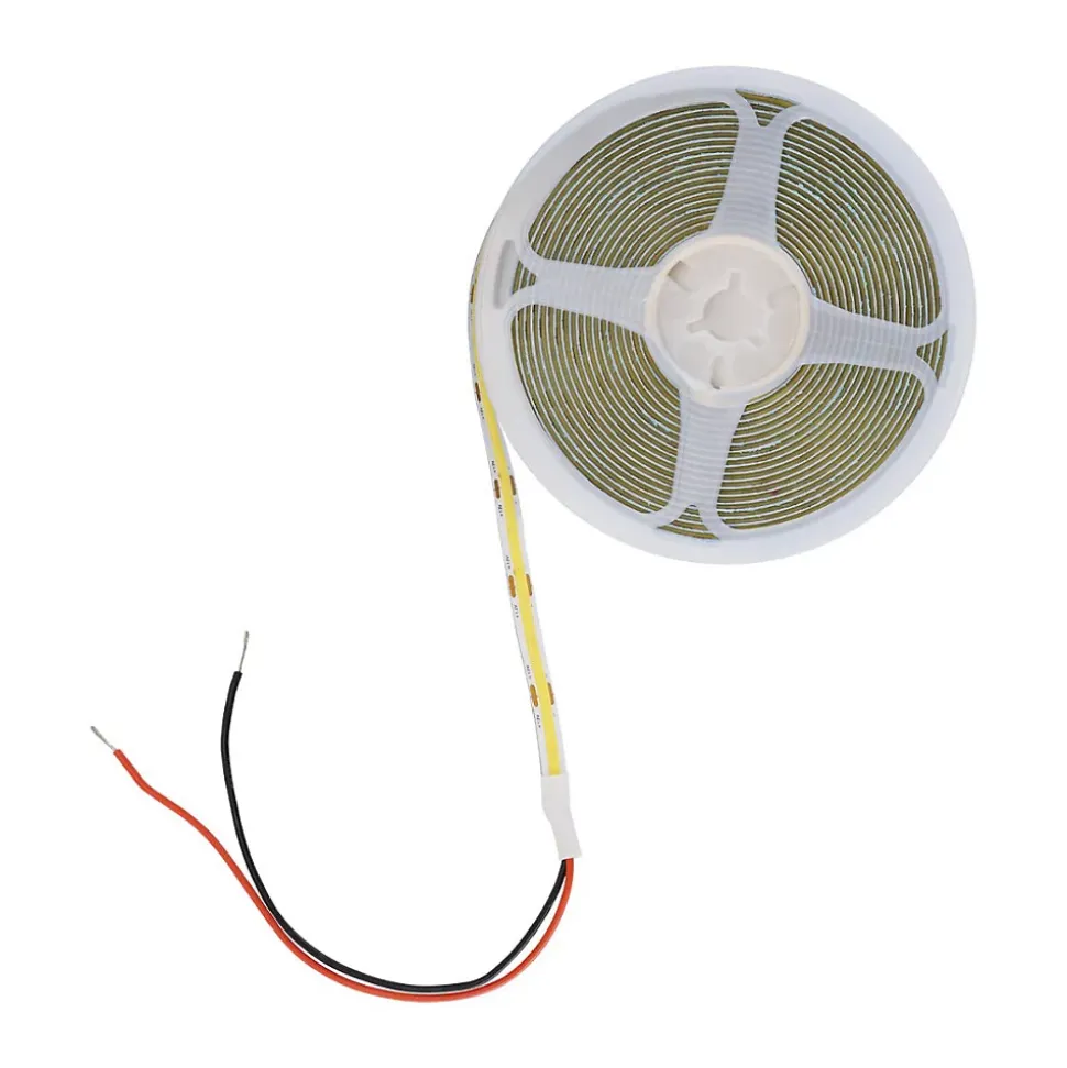 Idéal pour des applications intérieures exigeantes en finesse et en rendu, le ruban LED COB 12V 5M 320 LED/m offre un éclairage homogène, continu et sans points lumineux visibles. Compact et puissant, il est conçu pour des finitions haut de gamme.Détail technique du ruban LED COB 12V 5 mètresTension d’alimentation : 12V DC.Consommation totale : 25W (5W/m).Luminosité totale : 2630 lumens.Efficacité lumineuse : 105 lm/W.Type de LED : COB.Densité : 320 LED par mètre.Angle de diffusion : 160°.Indice de rendu des couleurs (IRC) : Ra 92.Indice de protection : IP20, usage intérieur uniquement.Dimensions : 500 cm x 0,8 cm x 0,2 cm.Recoupable tous les : 2,5 cm.Classe énergétique : F.Durée de vie estimée : ~25 000 heures.Certification : CE & RoHS.Garantie : 2 ans.⚠️ Ce ruban n’est pas dimmable et nécessite une alimentation 12V DC adaptée (non incluse).Pourquoi choisir ce ruban LED COB intérieur 12V ?Le ruban LED COB 12V IP20 se distingue par sa finesse et sa précision d’éclairage. La technologie COB garantit une lumière parfaitement linéaire, sans effet de points, idéale pour les environnements professionnels ou les agencements décoratifs de qualité.Grâce à son IRC élevé de 92, il restitue fidèlement les couleurs, ce qui en fait un excellent choix pour les boutiques, galeries, ou intérieurs design. La possibilit