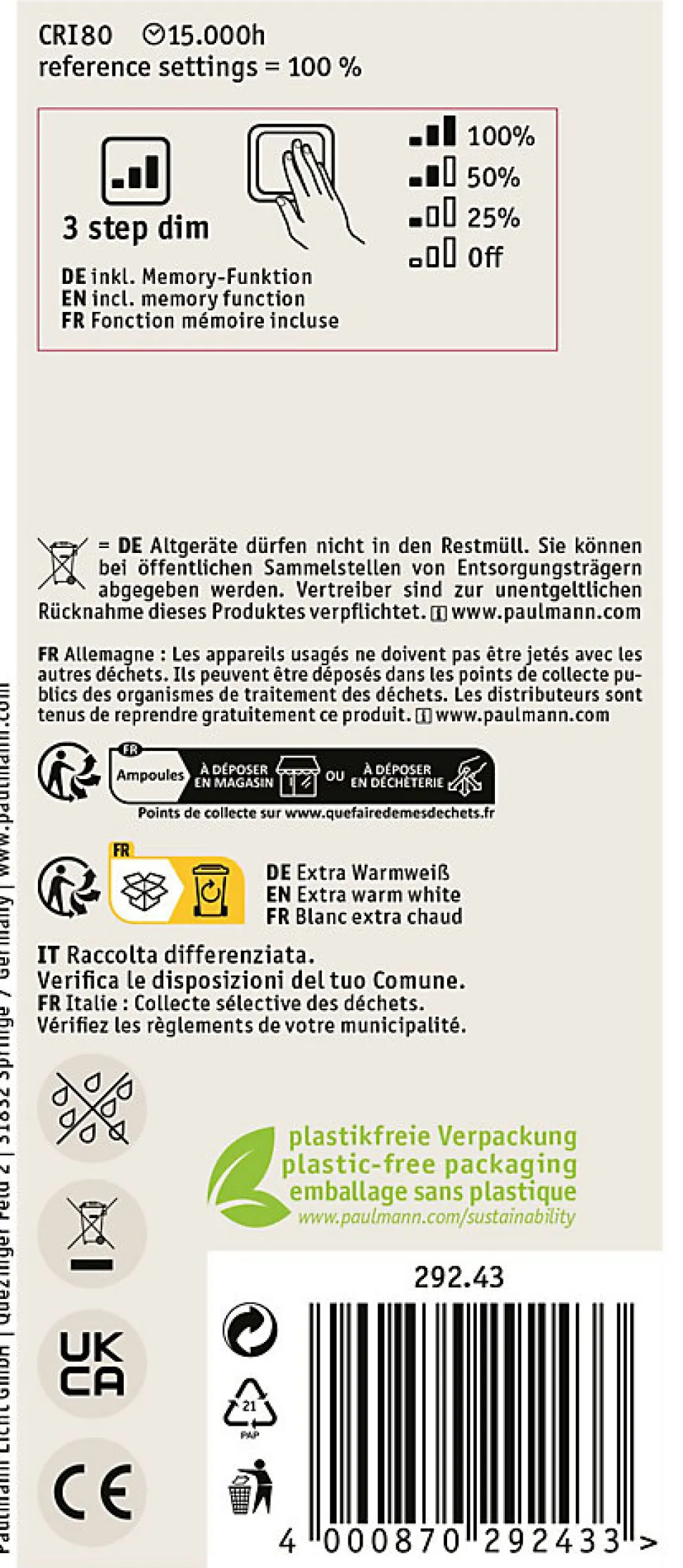 Les ampoules LED décoratives Rustic Shine en verre fumé de 170 lm et 4,2 W combinent design nostalgique et technologie de pointe ! Fabriquées en verre plein de haute qualité à l’aspect fumé et dotée de filaments extra-fins en forme de S, l’ampoule cylindrique se distingue particulièrement par son design séduisant et attire le regard sur les suspensions rétro. Visuellement, les filaments fins rappellent les filaments rustiques des ampoules à incandescence. Elles apportent un charme vintage aux logements modernes et sont très économiques grâce à la technologie LED efficace. Elles sont idéales comme éclairage d’ambiance décoratif pour les lampes à poser, les appliques ou les plafonniers avec des douilles E27 standard. La température de couleur de 1800 K, qui plonge la pièce dans une lumière dorée confortable, assure un éclairage périphérique confortable. L’intensité lumineuse peut être réglée sur trois niveaux à l’aide d’un interrupteur conventionnel, ce qui permet de créer différentes ambiances lumineuses – une lumière tamisée pour les dîners détendus ou une lumière plus claire pour les activités quotidiennes. La fonction mémoire intégrée enregistre le dernier réglage sélectionné jusqu’au prochain allumage pour un confort maximal.