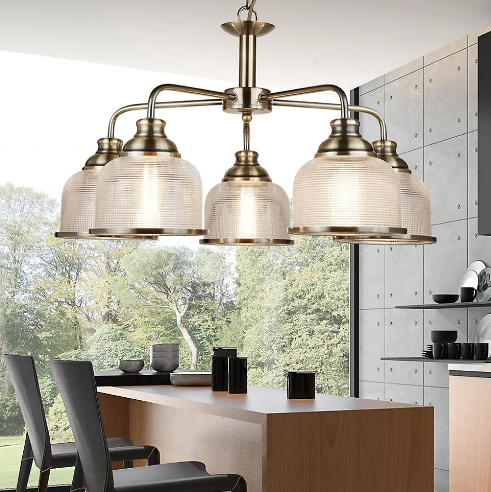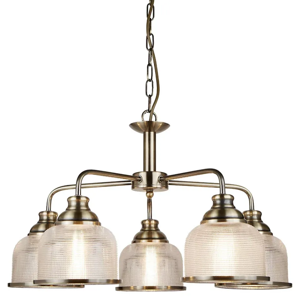 Searchlight Bistro – Plafonnier à 5 bras multiples blanc, laiton antique, E27Fini: laiton antique, blanc | Matériau: métal, verre | Indice de protection IP: IP20 | Hauteur min (cm): 34 | Hauteur max (cm): 88 | Diamètre (cm): 58 | Nbre de lumières: 5 | Type de lampe: E27 LED | Dimmable: Oui