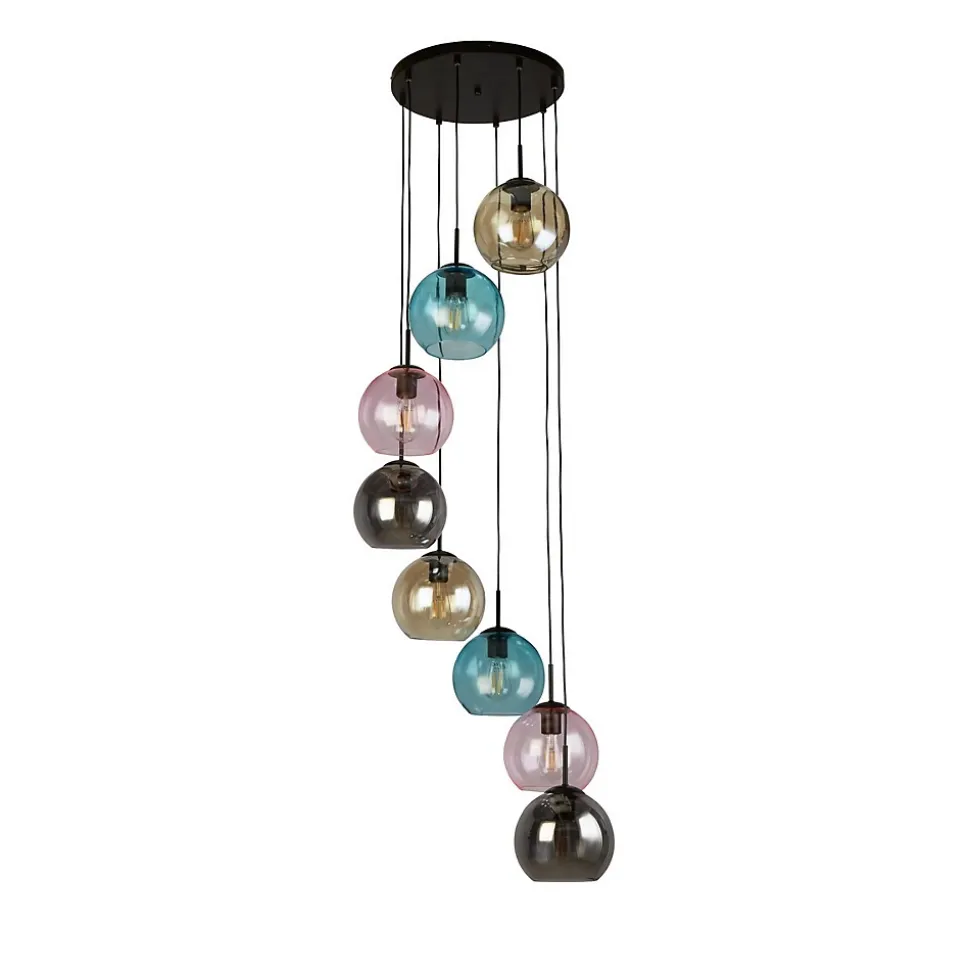 Searchlight Mardi Gras II Lampe suspendue à 8 ampoules, noir, verre coloréFinition : NoirMatériau : acier doux et verreIndice IP : IP20Hauteur : 200 cmLongueur : 54 cmLargeur : 54 cmType de lampe : E27Nombre de lampes : 8Ampoule incluse : nonIntensité variable : oui – Ampoule à intensité variable requisePoids : 6,44 kgPuissance (maximale) : 60 W
