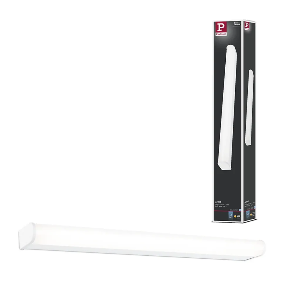 L’applique et éclairage de miroir Arneb a un design épuré. Elle convient parfaitement aux salles de bain Un cache acrylique satiné garantit une lumière uniforme et non éblouissante et les caches latéraux magnétiques en Blanc font élégamment disparaître les vis de montage.