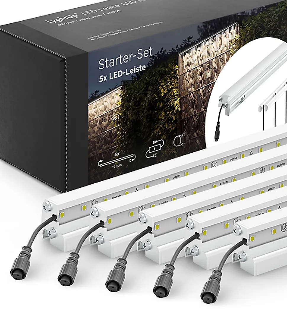 Ajoutez de l’éclairage à votre clôture en métal / gabion avec ce kit LyghtUp Led. Longueur : 2460 m/mTempérature de l’éclairage : Led blanc – chaleureux – 4 000 kVoltage d’entrée : + 24V DCElectricité d’entrée : 0,75 APuissance : 18 WNombre de led : 144Type de led : SMD 2835CRI : 80 RAbarette led étanche IP67Fixation avec visserie et plaquettes de 60 mm en inox fournies.Kit comprenant : 1 tranformateur / 1 prolongateur / 5 barettes LED ArgentMarque : LyghtUP