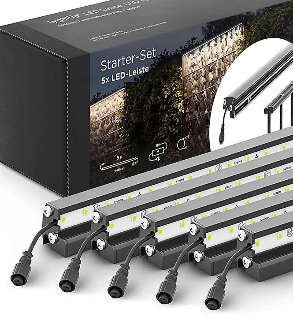 Ajoutez de l’éclairage à votre clôture en métal / gabion avec ce kit LyghtUp Led. Longueur : 2460 m/mTempérature de l’éclairage : Led blanc – chaleureux – 4 000 kVoltage d’entrée : + 24V DCElectricité d’entrée : 0,75 APuissance : 18 WNombre de led : 144Type de led : SMD 2835CRI : 80 RAbarette led étanche IP67Fixation avec visserie et plaquettes de 60 mm en inox fournies.Kit comprenant : 1 tranformateur / 1 prolongateur / 5 barettes LED AnthraciteMarque : LyghtUP