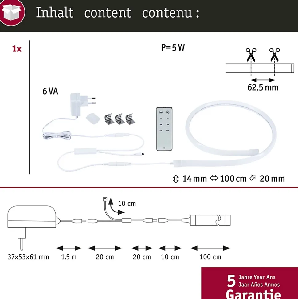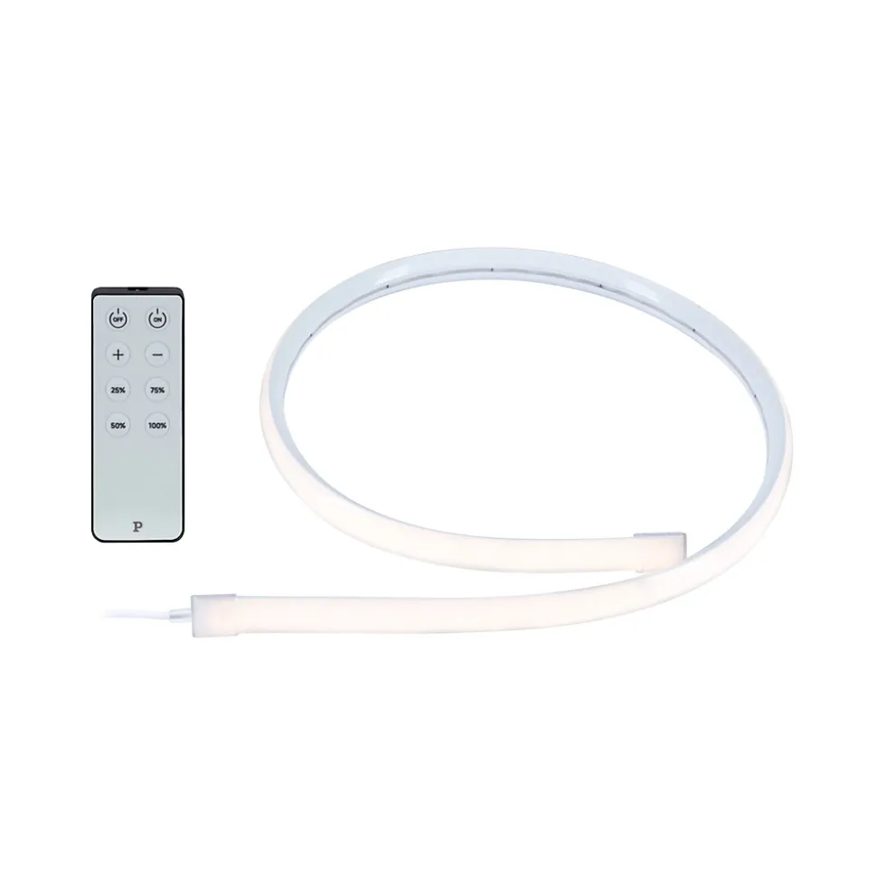 Le kit SimpLED Neon Delta de 1 m prêt à brancher en blanc chaud est particulièrement adapté à l’éclairage des armoires basses, des meubles, des coins de pièces ou des plafonds. Le profilé de coin a un Cover en forme d’angle de 90°, ce qui rend inutile la combinaison d’un profilé et d’un rubans LED. Le rubans LED peut être raccourci à la longueur souhaitée et fixé facilement à l’aide des clips de maintien vissables. Comme aucun point lumineux n’est visible, l’effet lumineux est particulièrement beau. Le rubans LED non raccourci est protégé contre les projections d’eau. Pour ne pas compromettre la fonction de protection après avoir raccourci le Strips, il est possible d’utiliser l’embout de finition fourni. Outre l’embout de finition, 3 clips de fixation, le rubans LED et une fiche, une télécommande sans fil est fournie. La télécommande permet d’allumer confortablement la lumière et de faire varier la luminosité en continu.