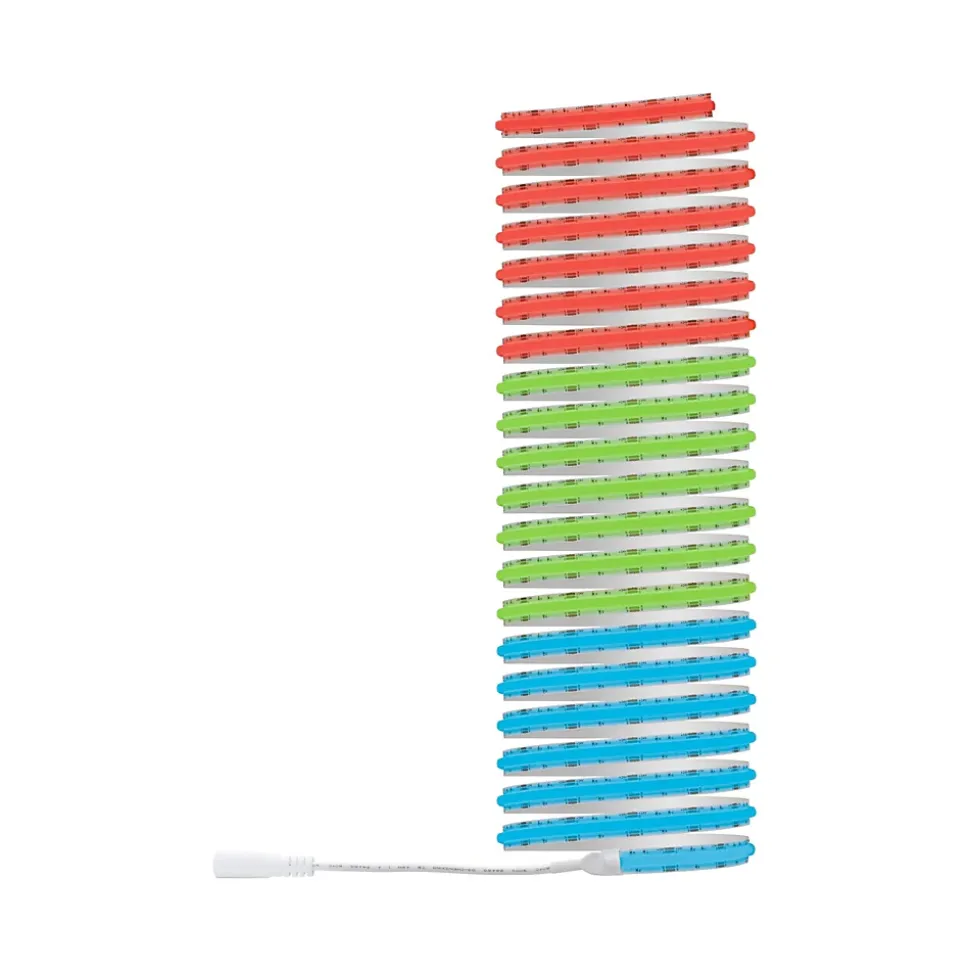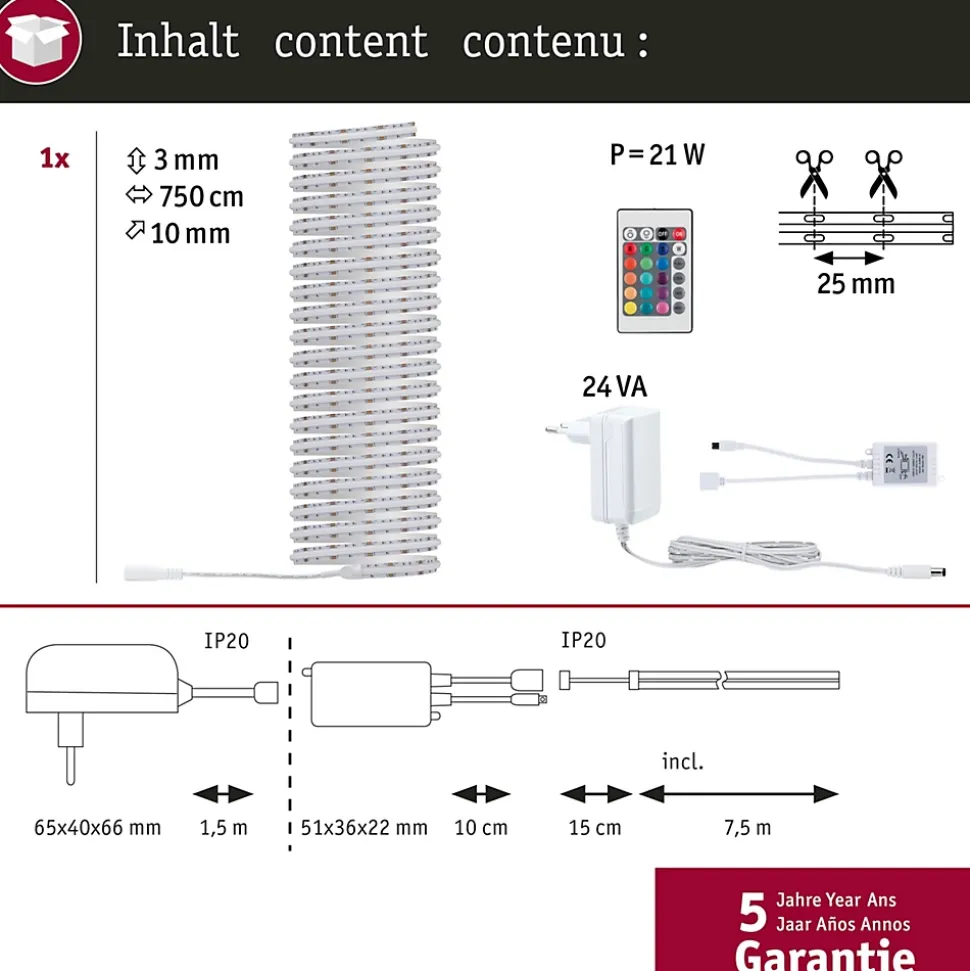 Kit prêt à fonctionner fourni avec alimentation 230/12V, câble d’alimentation et fiche secteur|Face arrière autocollante pour un montage simple|Montage simple par système de connexion|Matériau flexible pour montage sur des surfaces planes ou à relief|Le revêtement protège contre l’aspersion et la poussière.|LED RGB pour le changement de couleur et l’éclairage d’ambiance|Non compatible avec les rubans YourLED et MaxLED|Non extensible