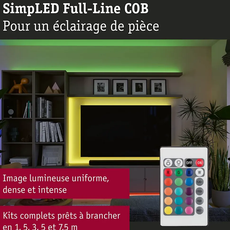 Le kit complet SimpLED Full-Line COB RGB contient, outre le Stripe d’une longueur de 7,5m, une fiche et est donc directement prêt à l’emploi. Que ce soit pour une lumière d’ambiance, une lumière d’orientation ou un éclairage de pièce indirect, le Stripe convient à différentes applications. Il produit une lumière absolument homogène sans points lumineux visibles. Grâce à sa fonction de changement de couleur d’ambiance, il crée une atmosphère individuelle dans l’habitat – de l’éclairage permanent monochrome aux effets lumineux multicolores, tout est possible. Le large angle de rayonnement de 180° répartit la lumière de manière optimale sans créer d’ombres. La couche de continue protège de la poussière et de l’humidité.