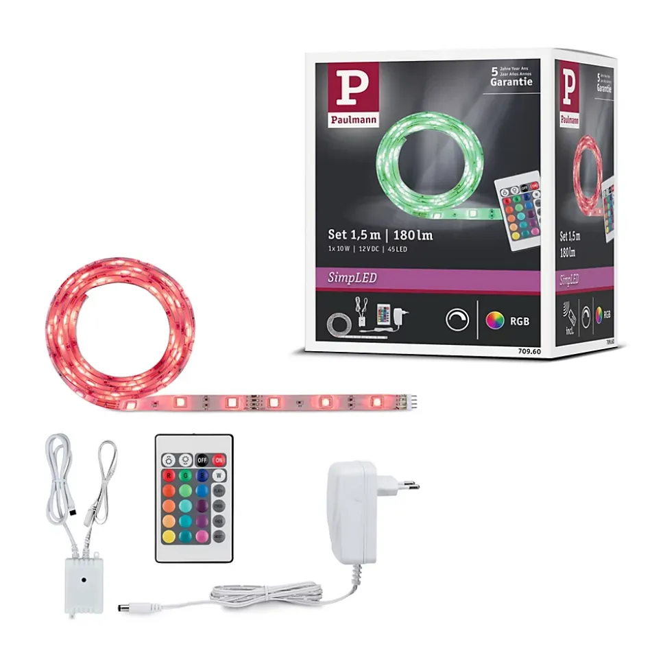 Kit prêt à fonctionner fourni avec alimentation 230/12V, câble d’alimentation et fiche secteur|Fourni avec télécommande pour régler les couleurs et les effets de lumière|Face arrière autocollante pour un montage simple|Matériel flexible pour le montage sur des surfaces planes ou courbes|Peut être raccourci en fonction de la longueur souhaitée (aux endroits marqués)|Le revêtement protège contre l’aspersion et la poussière.|LED RGB pour le changement de couleur et l’éclairage d’ambiance|Non extensible|Non compatible avec les rubans YourLED et MaxLED|Montage simple par système de connexion