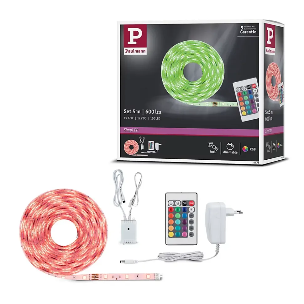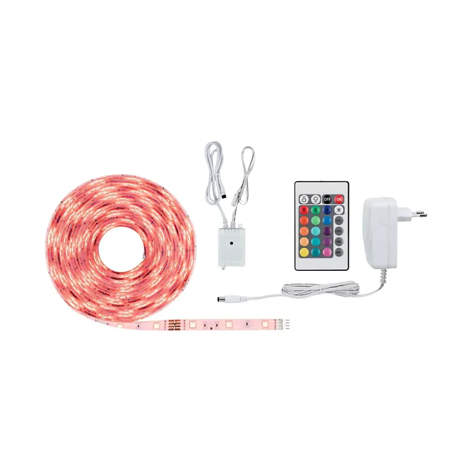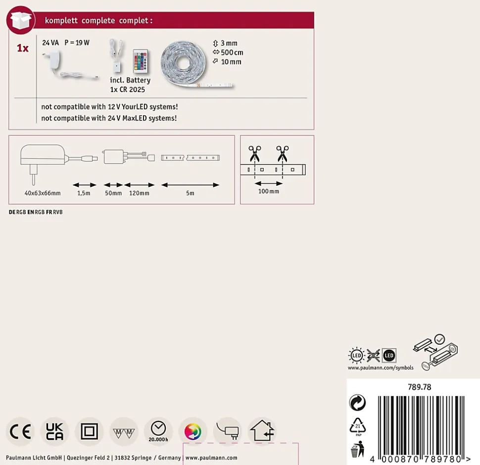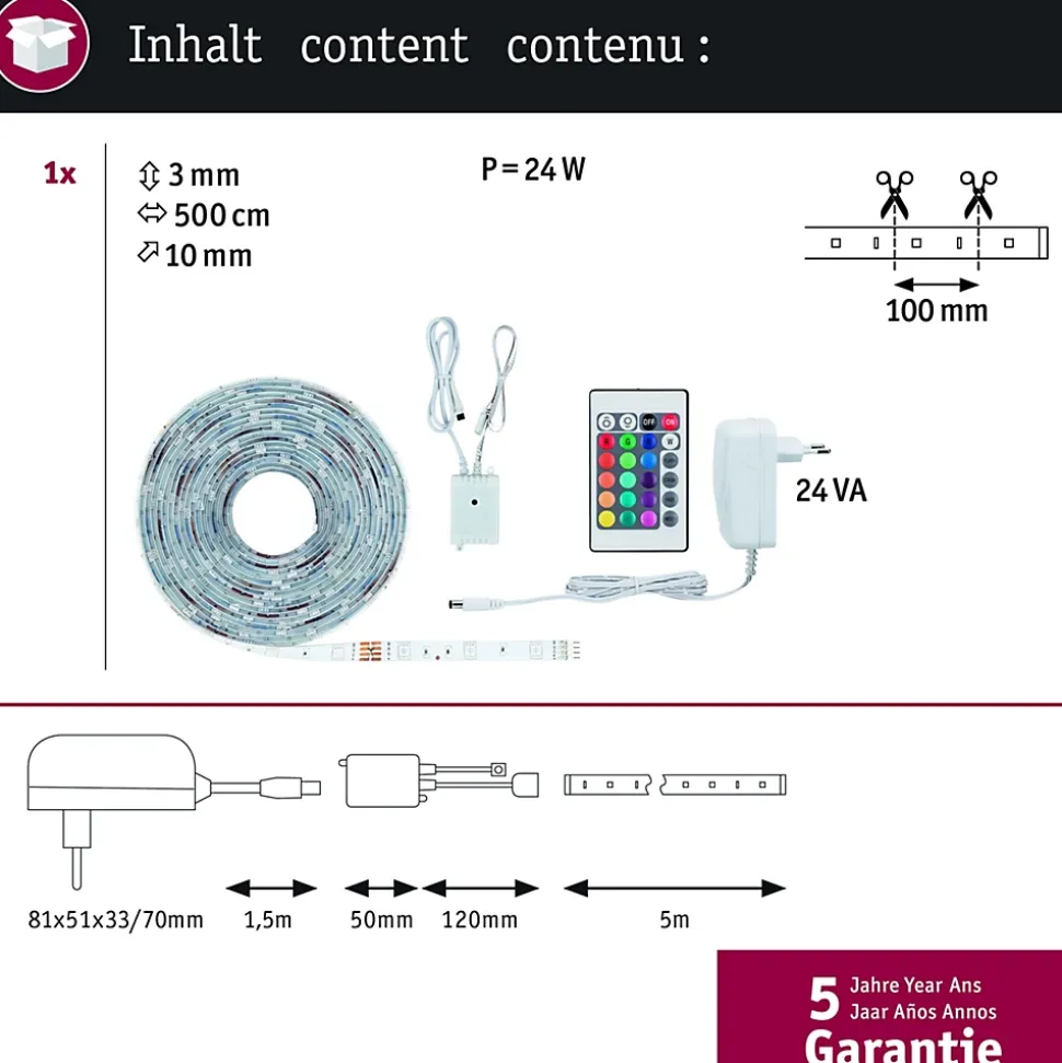Kit prêt à fonctionner fourni avec alimentation 230/12V, câble d’alimentation et fiche secteur|Fourni avec télécommande pour régler les couleurs et les effets de lumière|Face arrière autocollante pour un montage simple|Matériel flexible pour le montage sur des surfaces planes ou courbes|Peut être raccourci en fonction de la longueur souhaitée (aux endroits marqués)|Le revêtement protège contre l’aspersion et la poussière.|LED RGB pour le changement de couleur et l’éclairage d’ambiance|Non extensible|Non compatible avec les rubans YourLED et MaxLED|Montage simple par système de connexion
