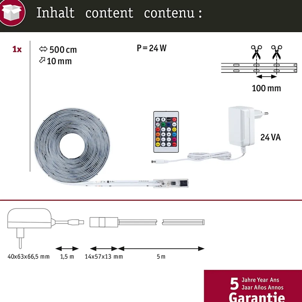 Kit prêt à fonctionner fourni avec alimentation 230/12V, câble d’alimentation et fiche secteur|Kit complet avec ruban, alimentation et télécommande|LED RGB pour le changement de couleur et l’éclairage d’ambiance|Chaque LED peut être commandée individuellement de manière numérique|Nombre élevé de 420 LED/m pour un éclairage particulièrement dense|En option, un capteur sonore intégré peut réagir à la musique