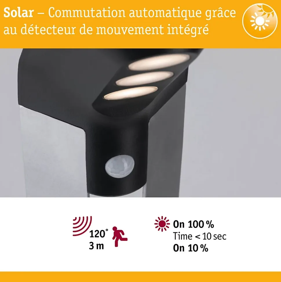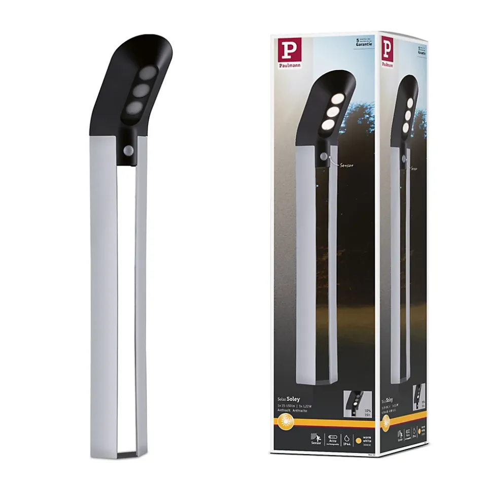La lampe solaire Soley en anthracite apporte de la lumière à vos allées et chemins. Grâce à la technologie solaire, aucun raccordement électrique n’est nécessaire pour l’installation. Durant la journée, la batterie se recharge au soleil et dès la nuit tombée commence à briller un petit balisage que remplace une lumière fonctionnelle dès qu’une personne s’approche.