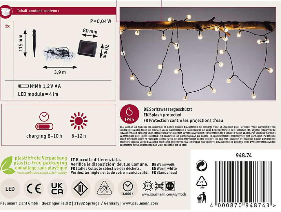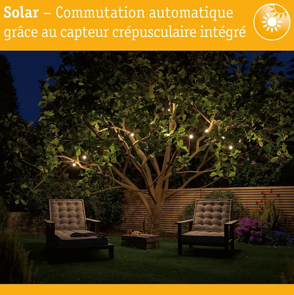 La guirlande LED Soala rehausse n’importe quel espace extérieur. Avec une lumière blanc chaud de 3000 kelvins, elle crée une atmosphère conviviale où l’on a envie de séjourner. Avec une longueur de 3,90 mètres et 30 LED fixes, la guirlande Soala attire tous les regards. Protégée contre les aspersions selon l’IP44, elle convient pour une utilisation à l’extérieur. Autre avantage : le détecteur crépusculaire intégré qui veille à ce que la guirlande s’allume automatiquement au coucher du soleil. La fonction solaire permet un fonctionnement de la guirlande indépendamment de toute source d’alimentation électrique.