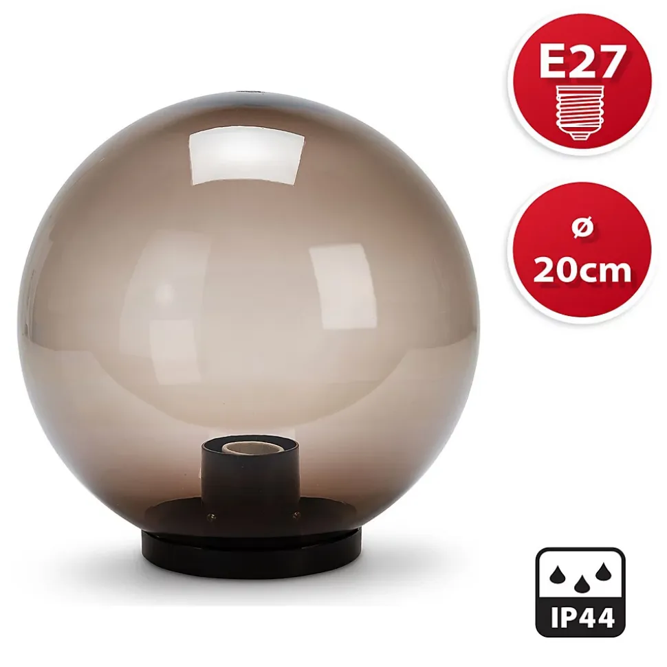 Globe d’extérieur IP44, diamètre 200 mm. Compatible avec les ampoules LED jusqu’à 40 W. Culot E27. Ampoule non incluse. Diffusion 360°. Matériau : PMMA. Le PMMA est un polymère hyper résistant aux chocs et au temps. Se connecte directement à la tension secteur. Velamp est une entreprise italienne qui répond de ses produits : méfiez-vous des imitations.
