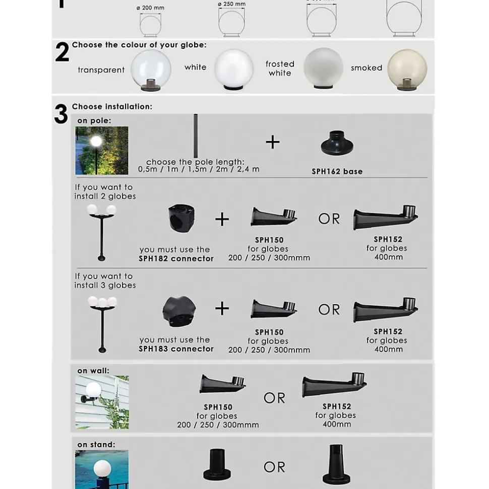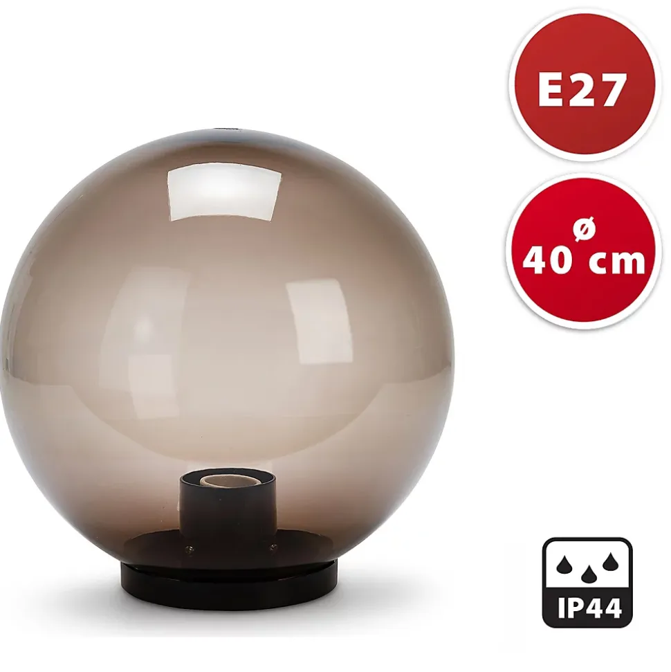 Boule d’extérieur IP44 diamètre 400 mm. Compatible avec les ampoules LED jusqu’à 100W ; culot E27 ; ampoule non incluse ; diffusion 360°. Matériau : pomma ; le pomma est un polymère hyper résistant aux chocs et au temps. Se connecte directement à la tension secteur. Velamp est une entreprise italienne qui répond de ses produits : Méfiez-vous des imitations