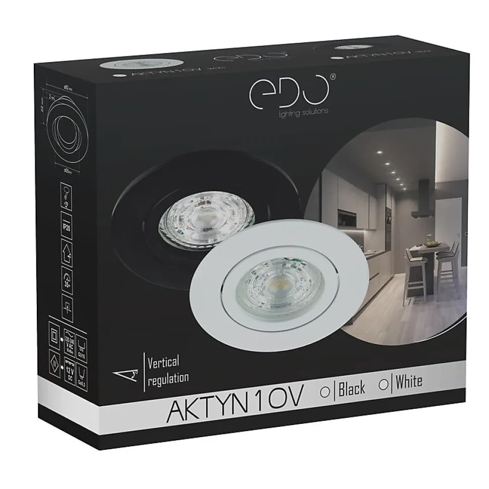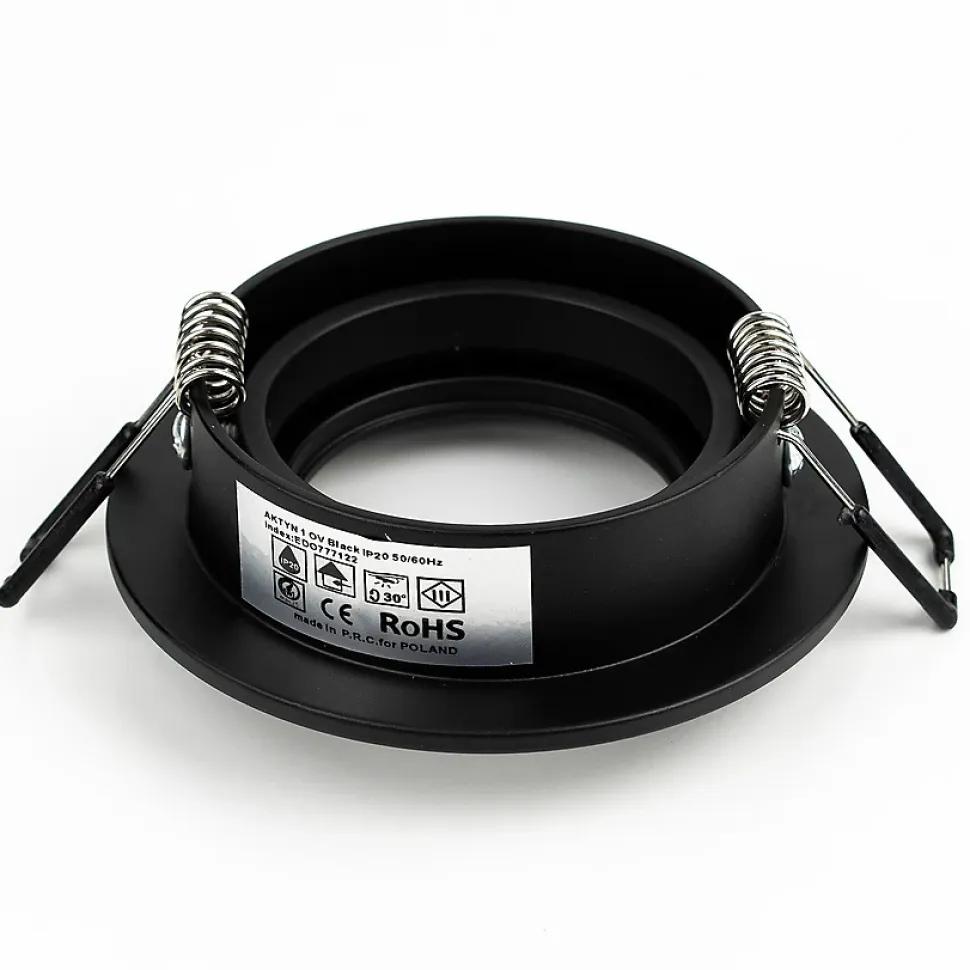 Spot encastrable au plafond AKTYN 1 OV Noir IP20. Rond noir et moderne ce spot halogène encastrable est une solution fonctionnelle adaptée aux intérieurs contemporains — du couloir à la cuisine ou à la chambre.Données généralesApplication : intérieurType de montage : encastréEmplacement d’installation : plafondCouleur : noirFinition : mateMatériau : aluminiumDimensions [mm] :- largeur : Ø82 mm- longueur : — diamètre de l’anneau : Ø55 mm- hauteur : 2 mm- hauteur totale : 22 mm- ouverture de montage : Ø70 mmOrientable : ouiVolet : -Douille incluse : nonType de douille : GU10 / Gx5.3Nombre de douilles : 1Source lumineuse incluse : nonDonnées techniquesPuissance maximale [W] : 35 WTension nominale [V] : 220-240 V AC / 12 V DCFréquence nominale [Hz] : 50-60 HzIndice de protection (IP) : IP20Classe de protection : II / III