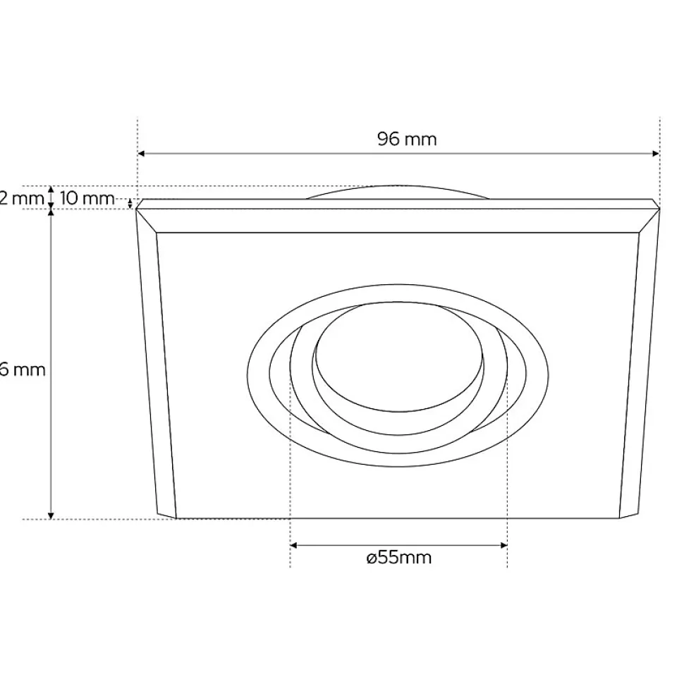 Spot encastrable au plafond CRYSTAL R Noir IP20. Carré noir moderne — spot halogène encastré. Solution encastrée fonctionnelle. Adapté aux aménagements contemporains du couloir à la cuisine comme à la chambre.Données généralesApplication : intérieurType de montage : encastréEmplacement d’installation : plafondCouleur : noir bague argentéeFinition : effet miroir bague brillanteMatériau : verre trempé aluminiumDimensions [mm] :- largeur : 96 mm- longueur : 96 mm- diamètre de l’anneau : Ø55 mm- hauteur : 10 mm- hauteur totale : 24 mm- ouverture de montage : 70–80 mmOrientable : ouiVolet : -Douille incluse : nonType de douille : GU10 / Gx5.3Nombre de douilles : 1Source lumineuse incluse : nonDonnées techniquesPuissance maximale [W] : 35 WTension nominale [V] : 220–240 V AC / 12 V DCFréquence nominale [Hz] : 50–60 HzIP : IP20Classe de protection : II / III