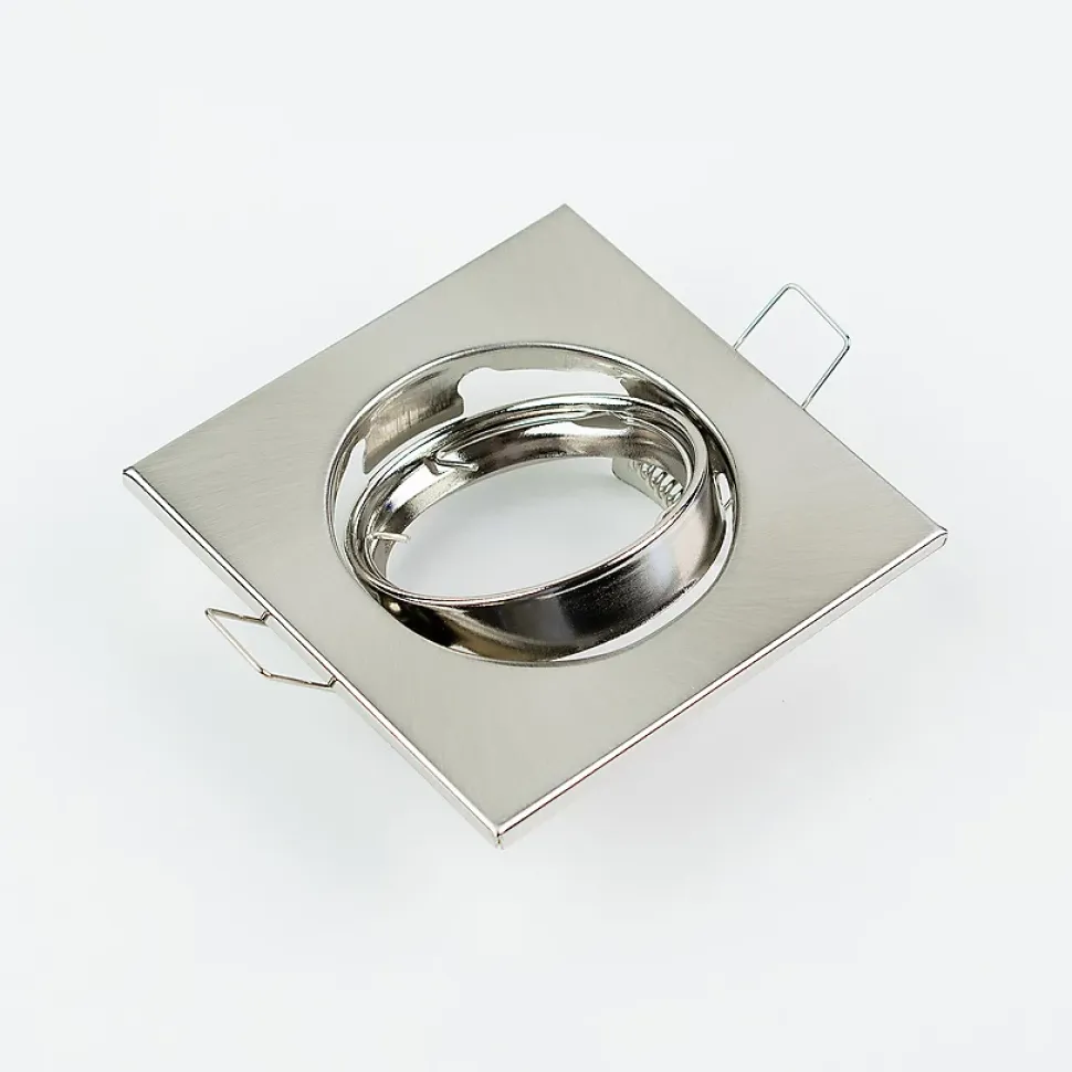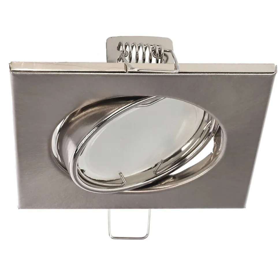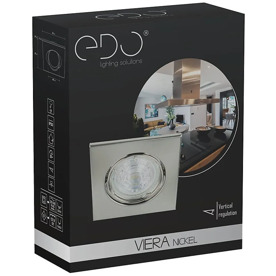 Spot encastrable au plafond orientable VIERA Nickel IP20. Carré finition nickel brillante et design moderne. Ce spot halogène encastré s’adapte parfaitement aux intérieurs contemporains.Données généralesApplication : intérieurType de montage : encastréEmplacement d’installation : plafondCouleur : nickelFinition : brillantMatériau : acierDimensions [mm] :- largeur : 86 mm- longueur : 86 mm- diamètre de l’anneau : Ø56 mm- hauteur : 4 mm- hauteur totale : 26 mm- ouverture de montage : Ø70 mmOrientable : ouiVolet : -Douille incluse : nonType de douille : GU10 / Gx5.3Nombre de douilles : 1Source lumineuse incluse : nonDonnées techniquesPuissance maximale [W] : 35 WTension nominale [V] : 220-240 V AC / 12 V DCFréquence nominale [Hz] : 50-60 HzIndice de protection (IP) : IP20Classe de protection : II / IIIContenu en mercure : nonTempérature ambiante [°C] : -20…50℃