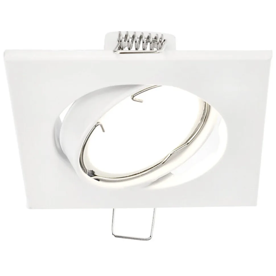 Spot encastrable au plafond orientable VIERA Blanc IP20. Carré blanc et moderne ce spot halogène encastré est une solution fonctionnelle et élégante. Idéal pour les intérieurs contemporains — du couloir à la cuisine.Données généralesApplication : intérieurType de montage : encastréEmplacement d’installation : plafondCouleur : blancFinition : mateMatériau : acierDimensions [mm] :- largeur : 86 mm- longueur : 86 mm- diamètre de l’anneau : Ø56 mm- hauteur : 4 mm- hauteur totale : 26 mm- ouverture de montage : Ø70 mmOrientable : ouiVolet : -Douille incluse : nonType de douille : GU10 / Gx5.3Nombre de douilles : 1Source lumineuse incluse : nonDonnées techniquesPuissance maximale [W] : 35 WTension nominale [V] : 220-240 V AC / 12 V DCFréquence nominale [Hz] : 50-60 HzIndice de protection (IP) : IP20Classe de protection : II / IIIContenu en mercure : nonTempérature ambiante [°C] : -20…50℃
