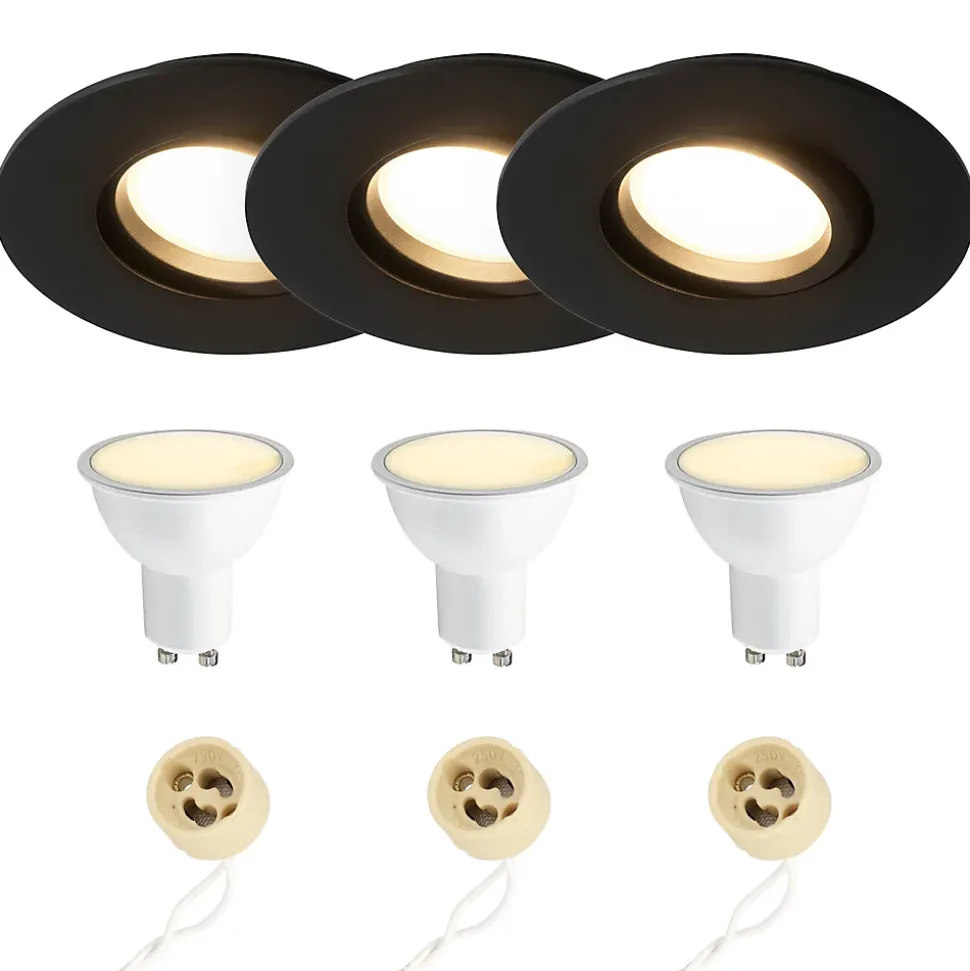 Kit d’éclairage complet prêt à être installé :Spot de plafond étanche POLI Black IP44, rond, noir | EDO777861 | EDO Solutions + ampoule FARI LED GU10 5,5W 3000K blanc chaud WW 500 lm 120° EDO777461 EDO Solutions + douille/porte-lampe céramique GU10SPÉCIFICATIONS TECHNIQUES DU SPOT✔️Utilisation : intérieur✔️Type de montage : encastré✔️Lieu de montage : plafond✔️Couleur : noir✔️Matériau : aluminium✔️Type de finition : sablé✔️Diffuseur : transparent✔️Orientable : oui✔️Douille incluse : oui✔️Nombre de douilles : 1✔️Type de douille : GU10 / MR16✔️Source lumineuse incluse : non✔️Puissance maximale (W) : 35✔️Tension nominale (V) : 220-240 AC✔️Fréquence nominale : 50-60 Hz✔️Indice de protection : IP44✔️Classe de protection : II✔️Contenu en mercure : non✔️Conditions ambiantes admissibles (℃) : -20 ~ +40✔️Largeur (mm) : 95✔️Hauteur (mm) : 40✔️Diamètre de l’anneau (mm) : 54✔️Distance minimale par rapport à l’objet éclairé (mm) : 500✔️Découpe de montage (mm) : 75✔️Poids (g) : 168SPÉCIFICATIONS TECHNIQUES DE L’AMPOULE GU10 :✔️Puissance : 5,5W✔️Flux lumineux : 500 lm✔️Température de couleur : 3000K (blanc chaud)✔️Source lumineuse : LED SMD✔️Culot : GU10✔️Classe énergétique : F✔️Angle de diffusion : 120°✔️Durée de vie : 20 000 h✔️Nombre de cycles marche/arrêt : 15 000✔️Alimentation : 220V-240V✔️Couleur du diffuseur : opaleSPÉCIFICATIONS TECHNIQUES DE LA DOUILLE / PORTE-LAMPE GU10 :Douille céramique destinée aux ampoules halogènes à culot GU10, alimentées par une tension ne dépassant pas 250V.Paramètres :✔️Courant nominal : 2A✔️Type de culot de la source lumineuse : GU10✔️Tension nominale : max. 250V✔️Type de matériau : douille ✔️céramique