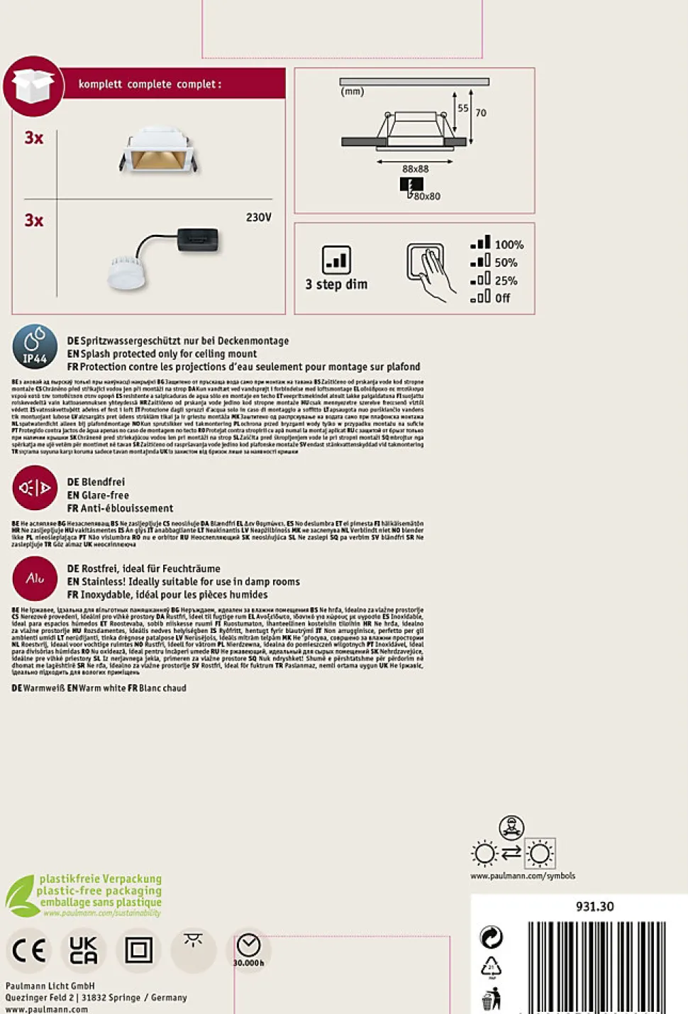 Température de couleur: 2700K – Blanc chaud|Pour raccordement direct au secteur 230V|Ampoule LED amovible incluse|Protection IP : IP44 – Protection contre les projections d’eau|Un simple commutateur permet de faire varier la luminosité sur 3 niveaux