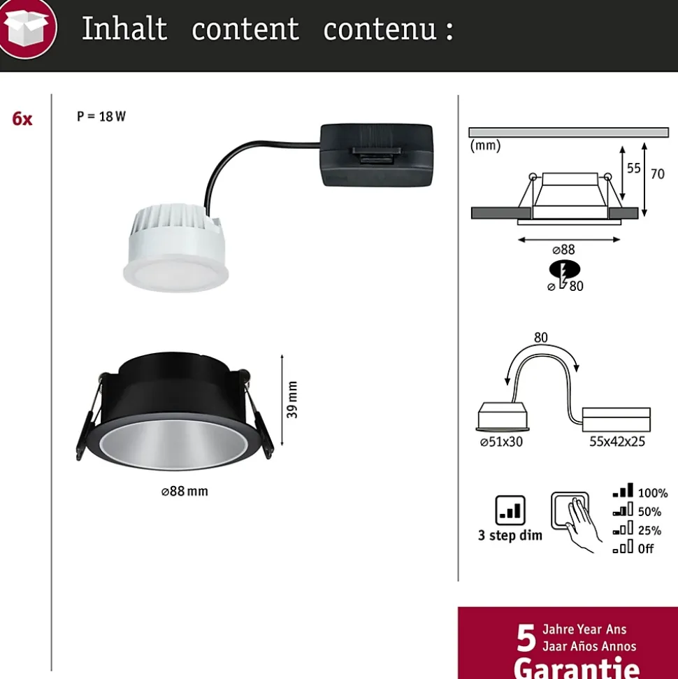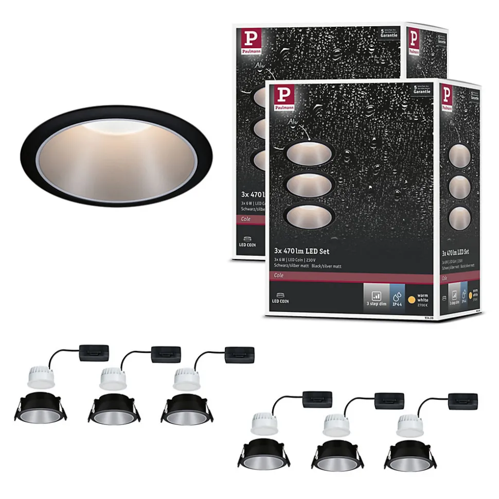 Coup de foudre clairvoyant ! Avec leurs ampoules en retrait, les six spots encastrés Cole en Noir/Argent se fondent presque dans le plafond. Mais sitôt repérés, impossible de s’en détourner. La lumière des Coin en retrait sur la surface argentée dépolie garantit un éclairage doux et non éblouissant. De plus, ils convainquent par leur technologie brillante : Les LED Coin remplaçables diffusent une agréable lumière blanc chaud et se règlent sur trois niveaux avec un interrupteur conventionnel.