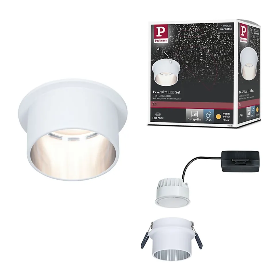 L’encastré décoratif Gil dans la couleur Blanc dépoli#Acier brossé au design bicolore assure un éclairage esthétique et apporte des accents non éblouissants au plafond. Grâce au cylindre décoratif proéminent, une faible profondeur d’encastrement est nécessaire par comparaison avec des points de lumière en retrait. Mais si tôt remarqués, ils aimantent le regard. Les projecteurs convainquent avec une technique brillante : les LED Coin remplaçables diffusent une agréable lumière blanc chaud. Ils se règlent sur trois niveaux avec un interrupteur conventionnel et sont combinables sans restriction. Ils requièrent un diamètre de perçage de 62 mm.
