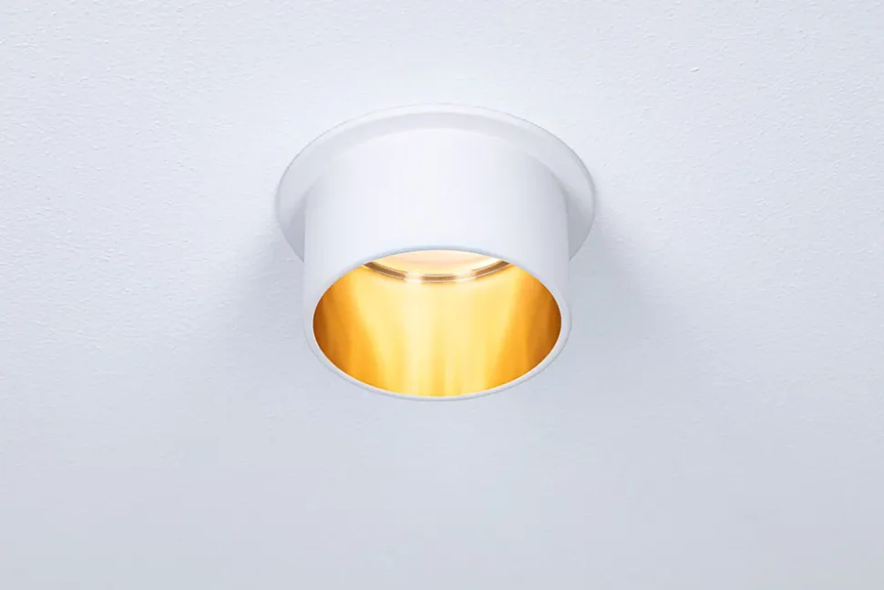 L’encastré décoratif Gil dans la couleur Blanc dépoli#Doré au design bicolore assure un éclairage esthétique et apporte des accents non éblouissants au plafond. Grâce au cylindre décoratif proéminent, une faible profondeur d’encastrement est nécessaire par comparaison avec des points de lumière en retrait. Mais si tôt remarqués, ils aimantent le regard. Les projecteurs convainquent avec une technique brillante : les LED Coin remplaçables diffusent une agréable lumière blanc chaud. Ils se règlent sur trois niveaux avec un interrupteur conventionnel et sont combinables sans restriction. Ils requièrent un diamètre de perçage de 62 mm.