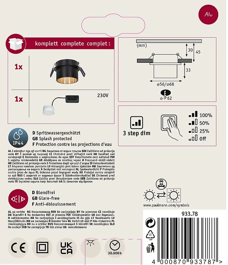Un simple commutateur permet de faire varier la luminosité sur 3 niveaux|Ampoule LED amovible incluse|Température de couleur: 2700K – Blanc chaud|Pour raccordement direct au secteur 230V