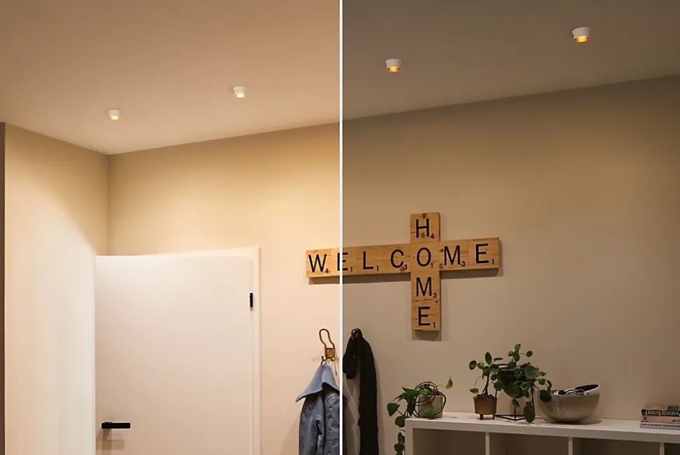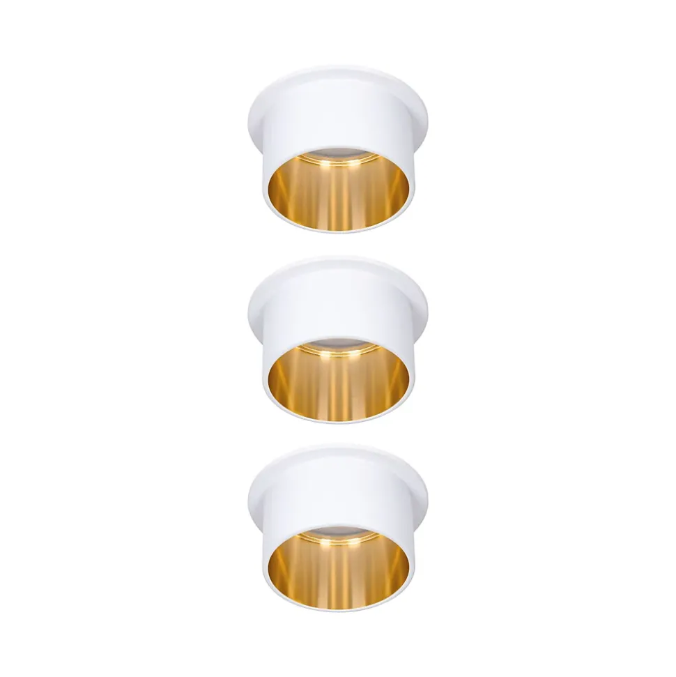 Les encastrés décoratifs Gil par kit de 3 dans la couleur Blanc dépoli#Doré au design bicolore assurent un éclairage esthétique et apportent des accents non éblouissants au plafond. Grâce au cylindre décoratif proéminent, une faible profondeur d’encastrement est nécessaire par comparaison avec des points de lumière en retrait. Mais si tôt remarqués, ils aimantent le regard. Les projecteurs convainquent avec une technique brillante : les LED Coin remplaçables diffusent une agréable lumière blanc chaud. Ils se règlent sur trois niveaux avec un interrupteur conventionnel et sont combinables sans restriction. Ils requièrent un diamètre de perçage de 62 mm.