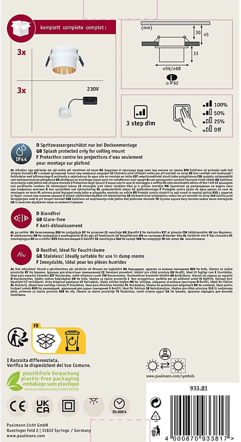 Un simple commutateur permet de faire varier la luminosité sur 3 niveaux|Ampoule LED amovible incluse|Température de couleur: 2700K – Blanc chaud|Pour raccordement direct au secteur 230V|Kit de 3 luminaires