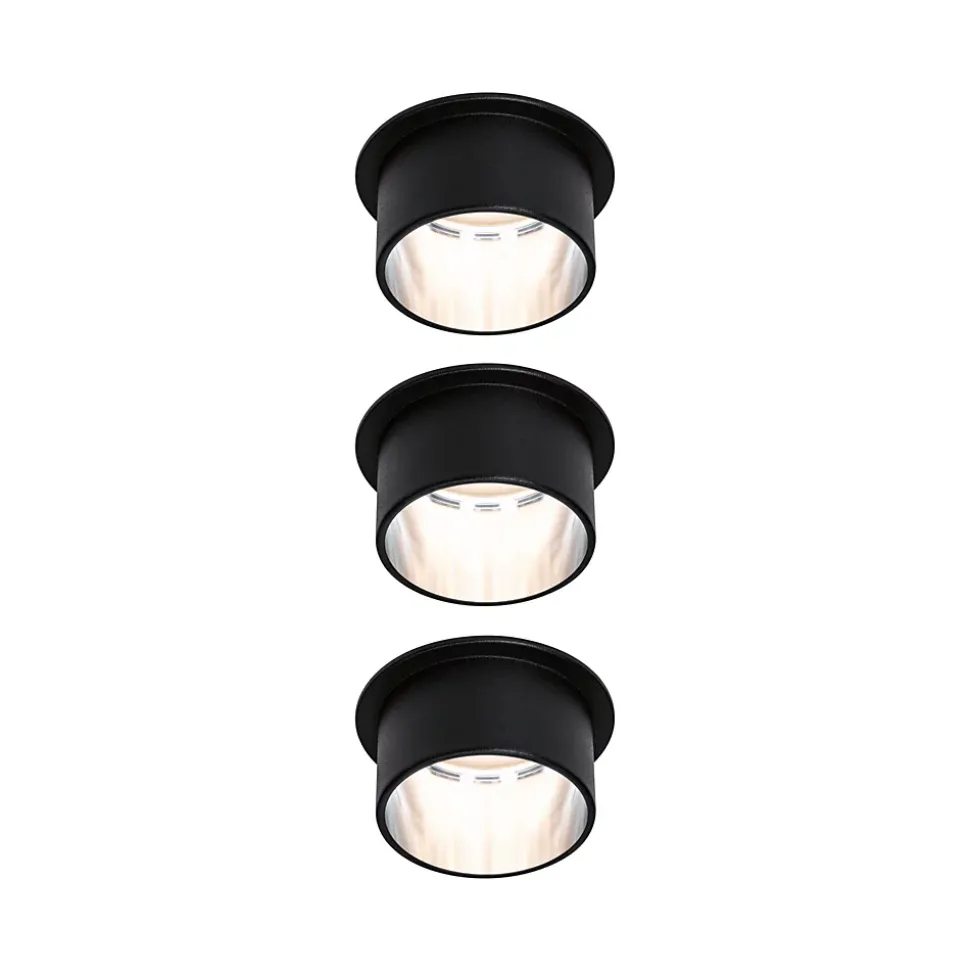 Les encastrés décoratifs Gil par kit de 3 dans la couleur Noir mat#Acier brossé au design bicolore assurent un éclairage esthétique et apportent des accents non éblouissants au plafond. Grâce au cylindre décoratif proéminent, une faible profondeur d’encastrement est nécessaire par comparaison avec des points de lumière en retrait. Mais si tôt remarqués, ils aimantent le regard. Les projecteurs convainquent avec une technique brillante : les LED Coin remplaçables diffusent une agréable lumière blanc chaud. Ils se règlent sur trois niveaux avec un interrupteur conventionnel et sont combinables sans restriction. Ils requièrent un diamètre de perçage de 62 mm.