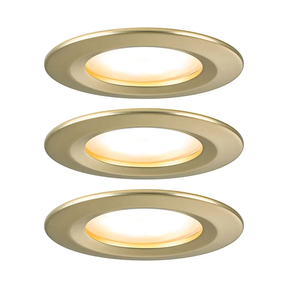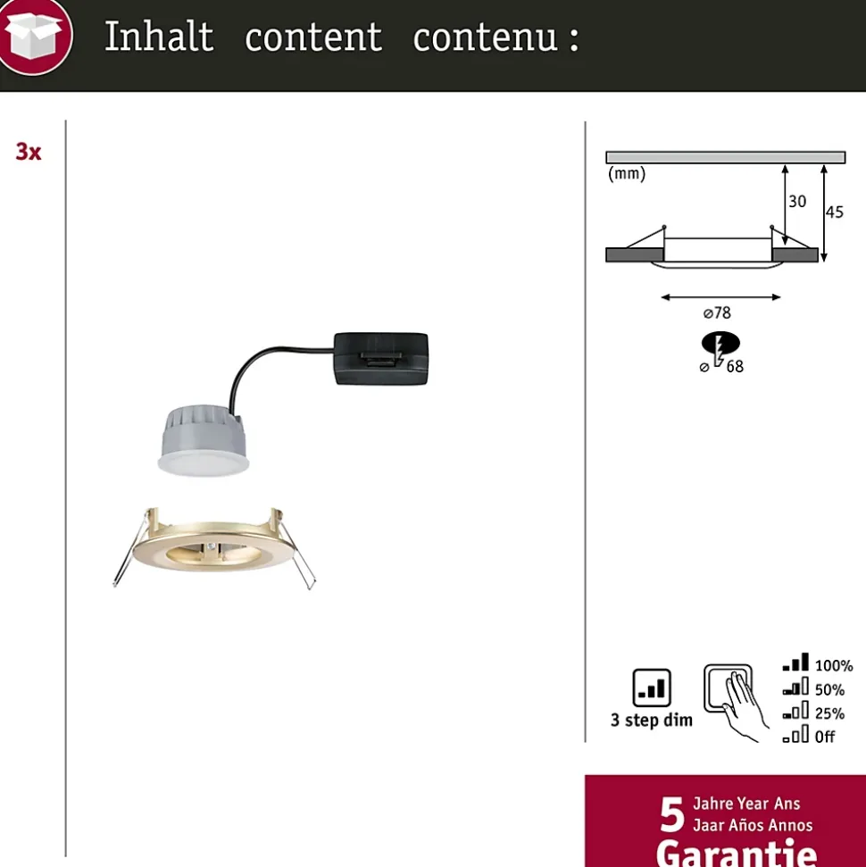 Kit de 3 luminaires à 470lm en doré mat|Farbtemperatur: 2700K – Warmweiß|Gradable sur 3 niveaux à l’aide d’un interrupteur courant|Protection IP : IP44 – Protection contre les projections d’eau|Matériau haut de gamme en alu moulé sous pression|Faible profondeur d’encastrement des spots encastrés Nova Coin|Installation simple des spots encastrés|Raccordement direct au 230 V grâce aux Coins connectables