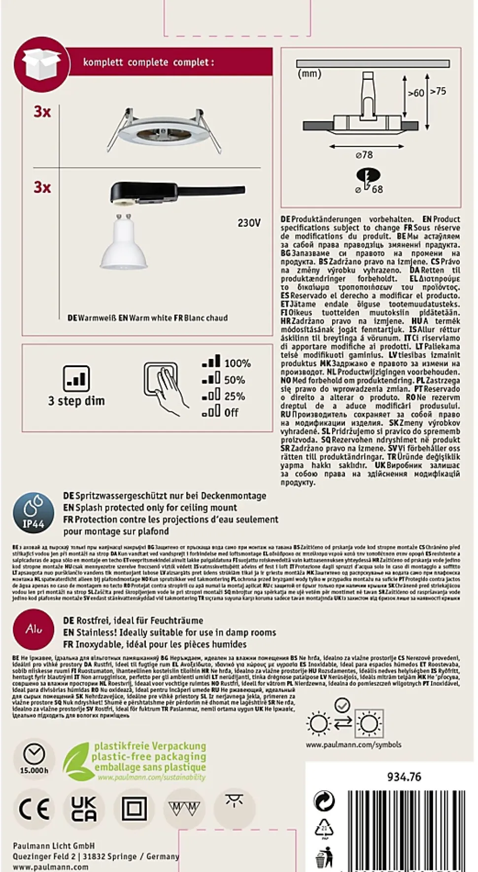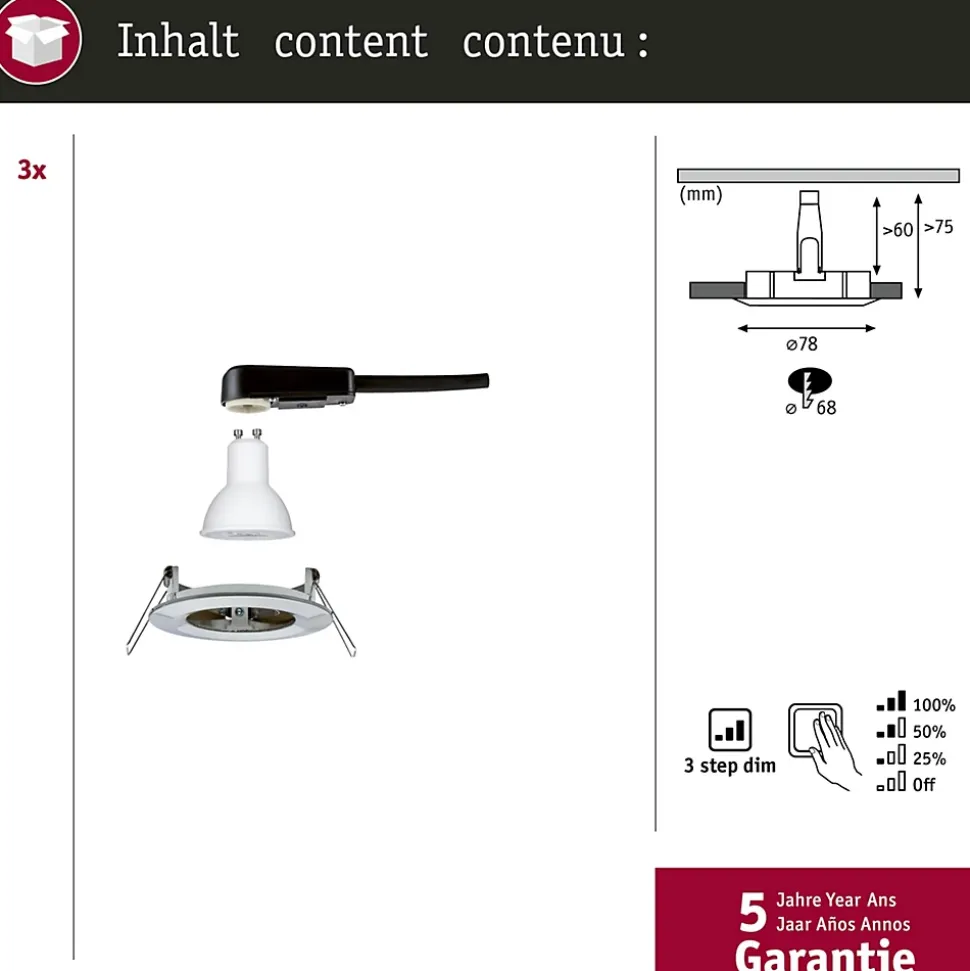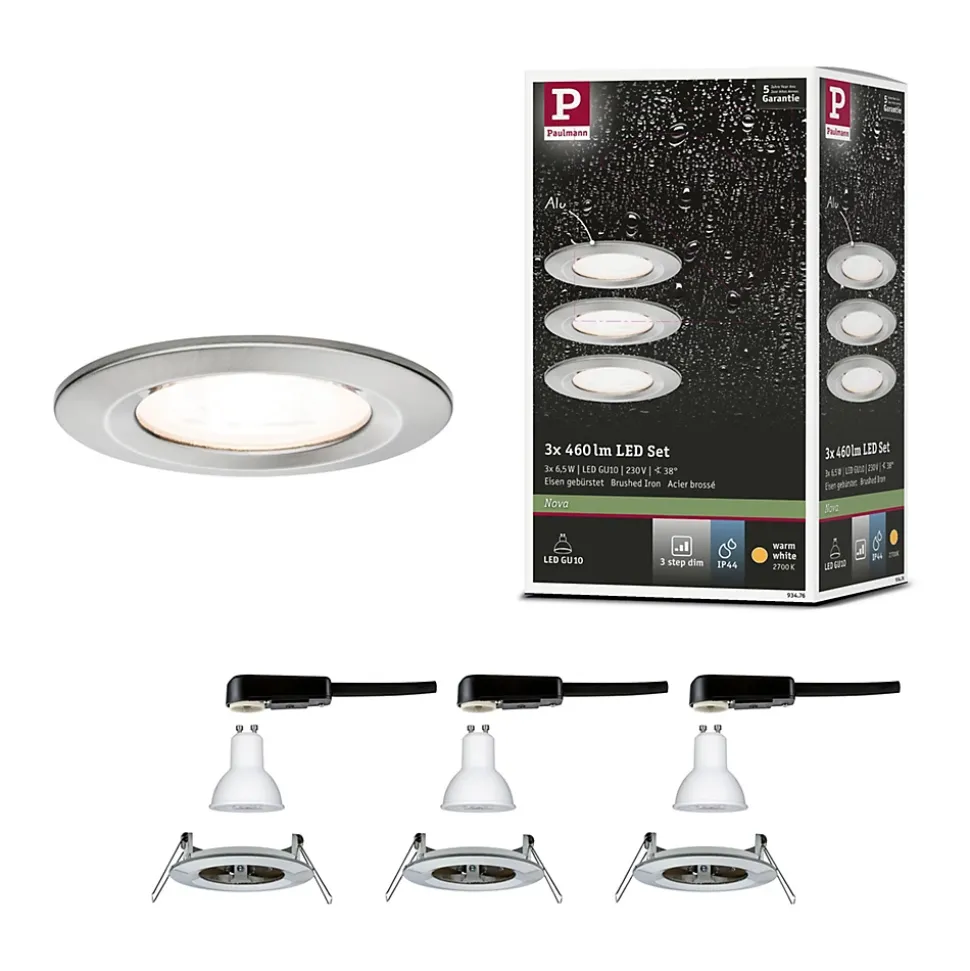 Les spots encastrés Nova ronds en Acier brossé avec 3×6,5W et 3x460lm offrent une lumière agréable, un design adapté et une haute efficacité énergétique. Le style pur n’est pas dévalorisé par des circlips : Comme l’ampoule est insérée par l’arrière, nul besoin de circlip. Grâce à la connexion 230 V directe, vous pouvez très facilement connecter des luminaires entre eux sans aucune limite. La fixation simple par ressorts de retenue conserve le plafond intact, même après plusieurs montages et démontages. La livraison inclut des ampoules LED GU10 performantes et durables dont la lumière blanc chaud crée une atmosphère conviviale. La fonction 3-Step-Dim intégrée vous permet de naviguer entre trois intensités de lumière en actionnant plusieurs fois un simple commutateur traditionnel.