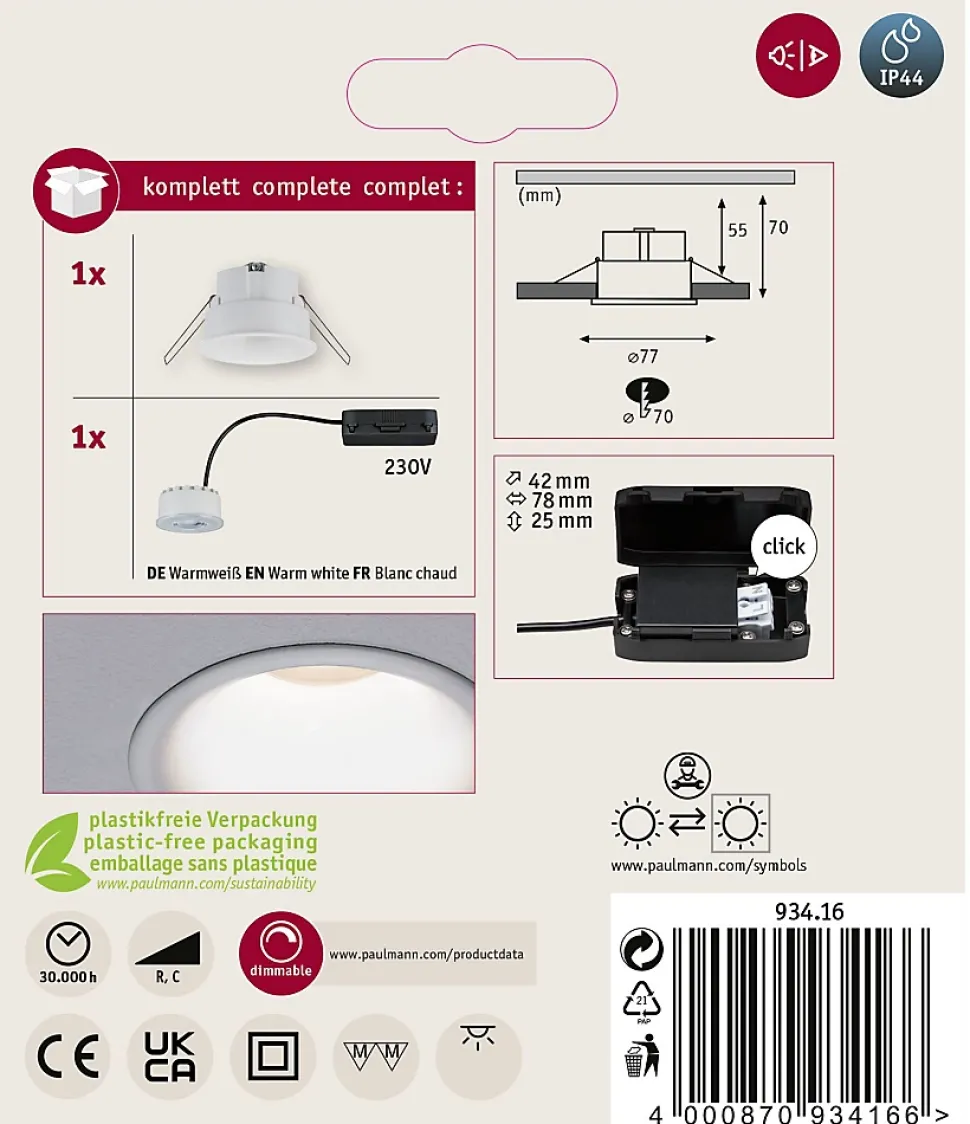 Intensité variable|Protection IP : IP44 – Protection contre les projections d’eau|Température de couleur: 2700K – Blanc chaud|Pour raccordement direct au secteur 230V