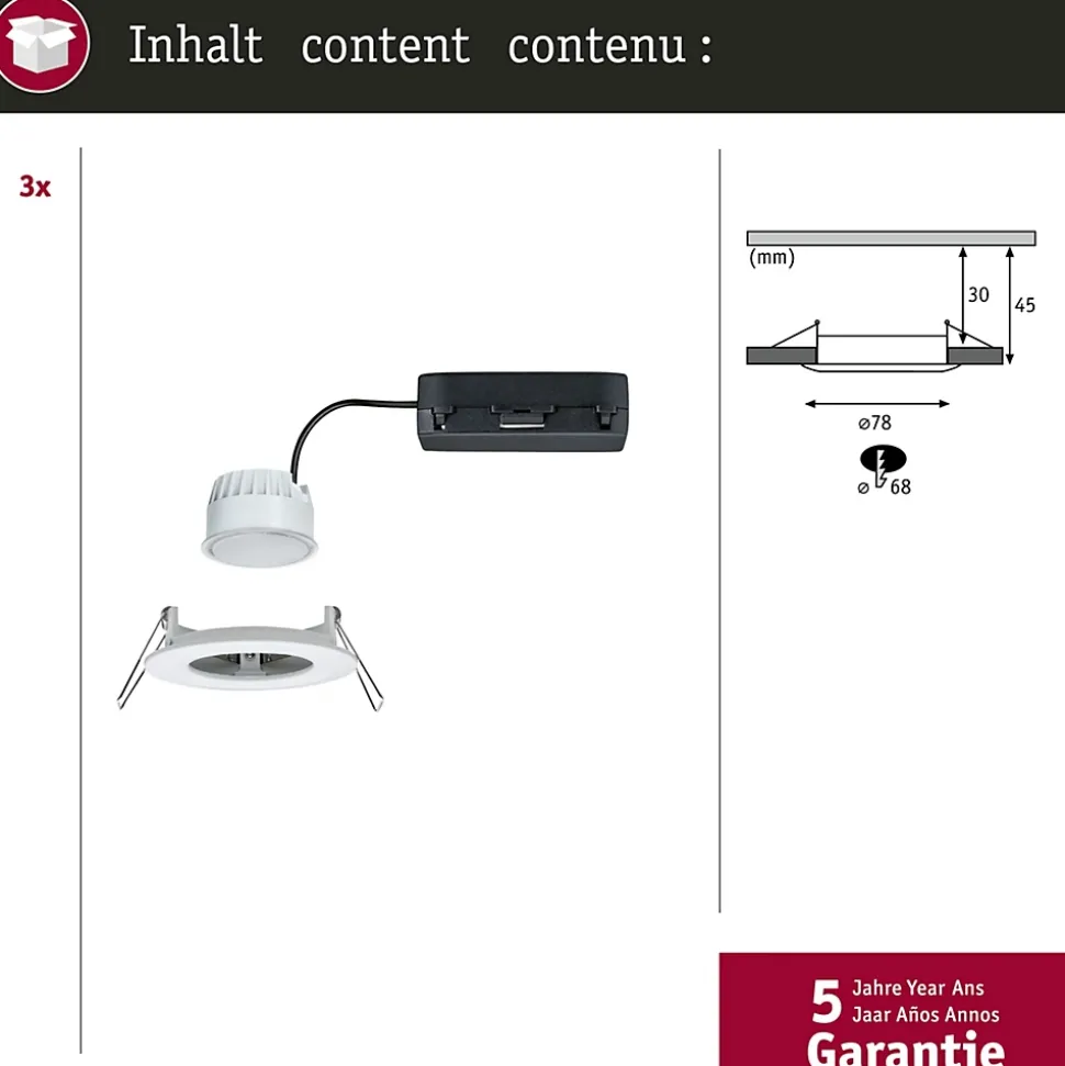 Kit composé de 3 luminaires fourni avec module LED|protection ip : ip 44 – protection contre des projections d’eau|Tunable White offre un choix infini, de lumière dorée (2200 K) à blanc lumière du jour (6500 K)|Changement de couleur multicolore RGBW|La fonction de mémoire enregistre le dernier niveau utilisé jusqu’à la prochaine mise en marche.|S’intègre parfaitement aux infrastructures Zigbee Smart Home existantes.|Possibilité de continuer à allumer et éteindre via l’interrupteur d’éclairage|Profondeur d’encastrement réduite (45 mm)|Raccordement direct au 230 V grâce aux Coins connectables
