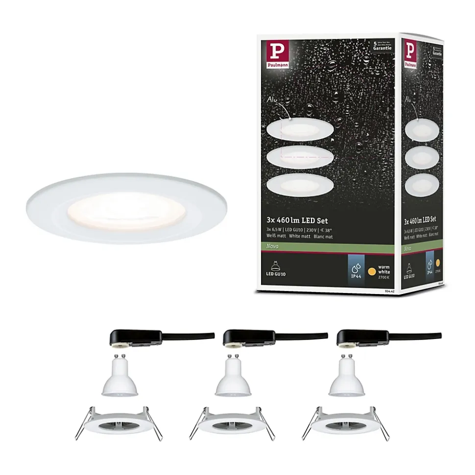 Les spots encastrés Nova ronds en blanc dépoli avec 3×6,5W et 3x460lm offrent une lumière agréable, un design adapté et une haute efficacité énergétique. Le style pur n’est pas dévalorisé par des circlips : Comme l’ampoule est insérée par l’arrière, nul besoin de circlip. Grâce à la connexion 230 V directe, vous pouvez très facilement connecter des luminaires entre eux sans aucune limite. La fixation simple par ressorts de retenue conserve le plafond intact, même après plusieurs montages et démontages. La livraison inclut des ampoules LED GU10 performantes et durables dont la lumière blanc chaud crée une atmosphère conviviale.