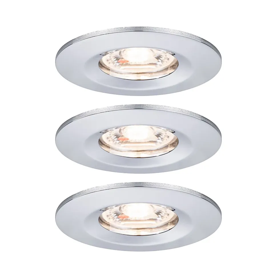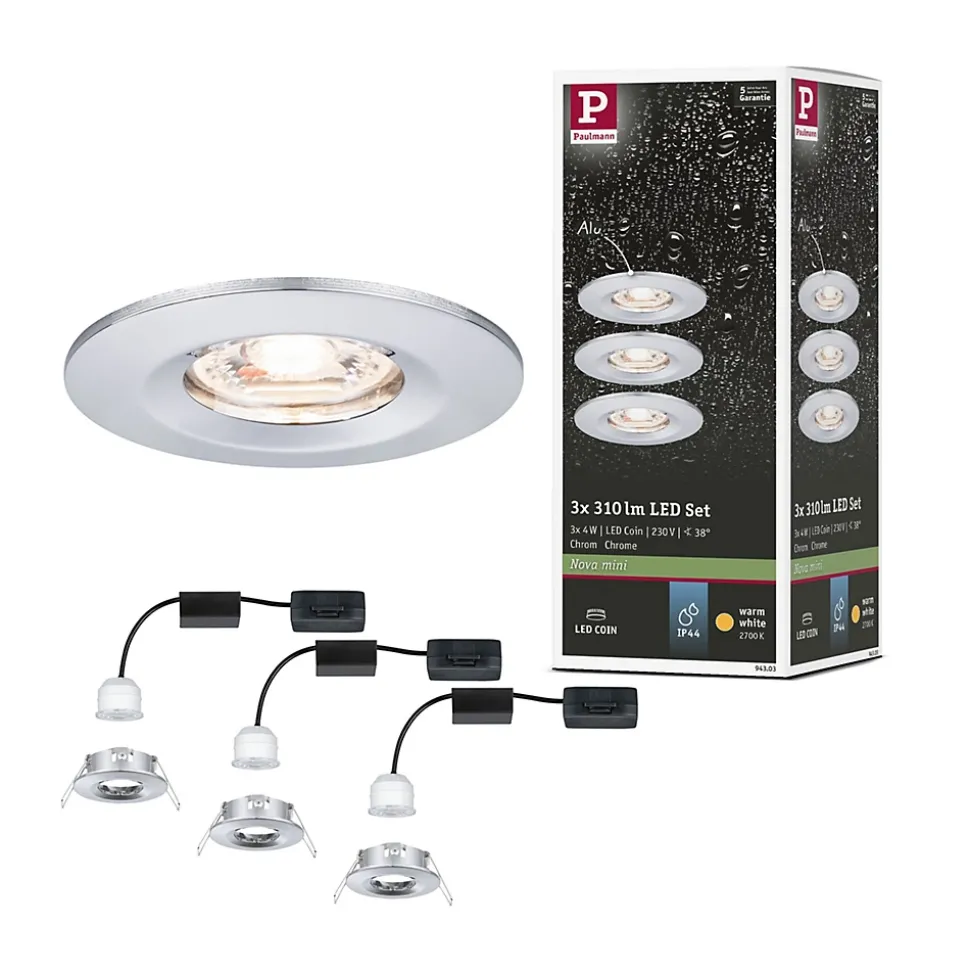 Kit composé de 3 luminaires fourni avec module LED|Température de couleur: 2700K – Blanc chaud|Pour raccordement direct au secteur 230V|Protection IP : IP44 – Protection contre les projections d’eau