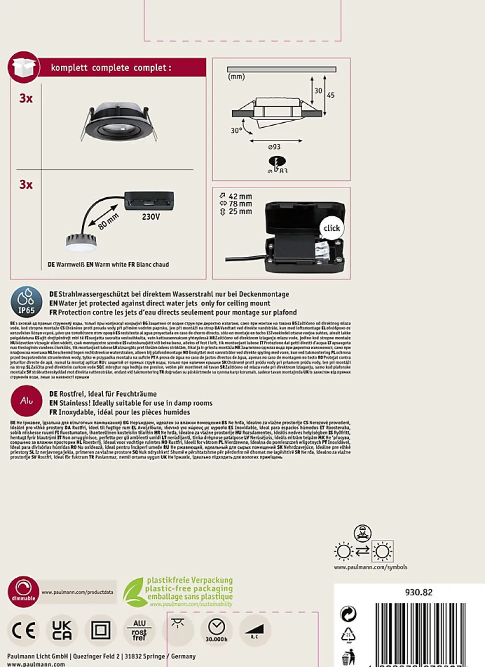 Kit composé de 3 luminaires fourni avec module LED|Température de couleur: 2700K – Blanc chaud|Avec verre de protection satiné|Très plat : le montage peut s’effectuer même avec une faible profondeur de la cavité de seulement 30 mm.|Pour raccordement direct au secteur 230V|Protection IP : IP65 – Protection contre les jets d’eau|Intensité variable