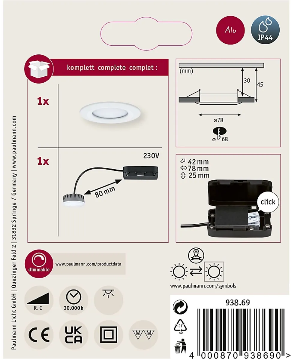 Kit composé de 1 luminaire avec module LED|Température de couleur: 2700K – Blanc chaud|Avec verre de protection satiné|Très plat : le montage peut s’effectuer même avec une faible profondeur de la cavité de seulement 30 mm.|Pour raccordement direct au secteur 230V|Boîte raccord avec double clip de fixation rapide pour la connexion du câble incluse|Protection IP : IP44 – Protection contre les projections d’eau|Intensité variable